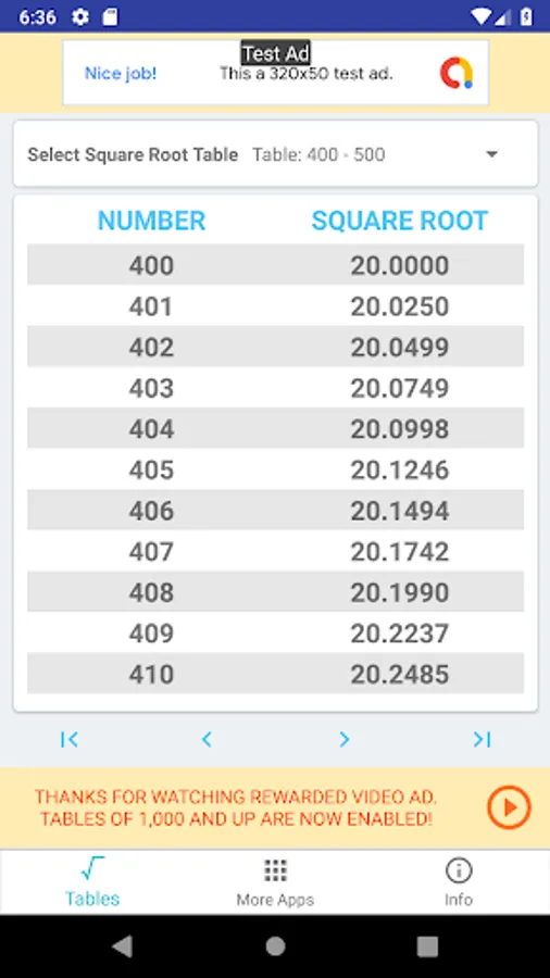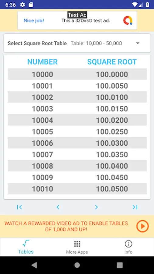 Square Root Table app allows user to find square root of numbers from 1 to 50,000.