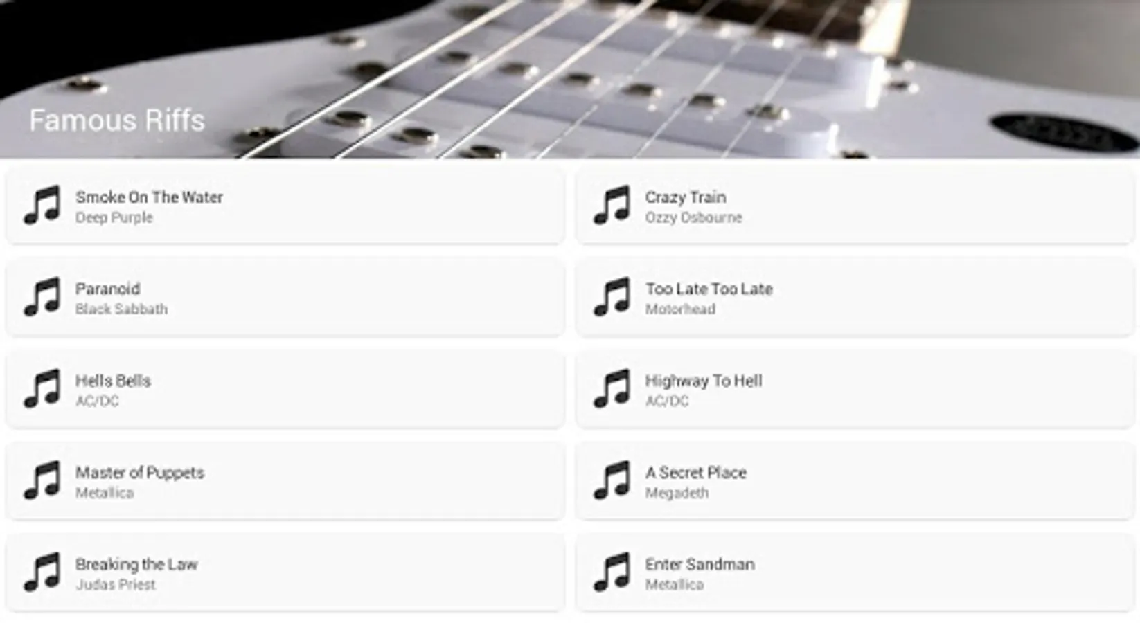 FamousRiffs is free app containing more than 150 the most outstanding rock and metal guitar riffs such artists as AC/DC, Metallica, Megadeth, KISS, Judas Priest, Ozzy Osbourne, Scorpions etc. It is perfect for beginner guitarists, because it contains quite simple riffs. Contains guitar riff tabulature and audio, as well as description of the song.