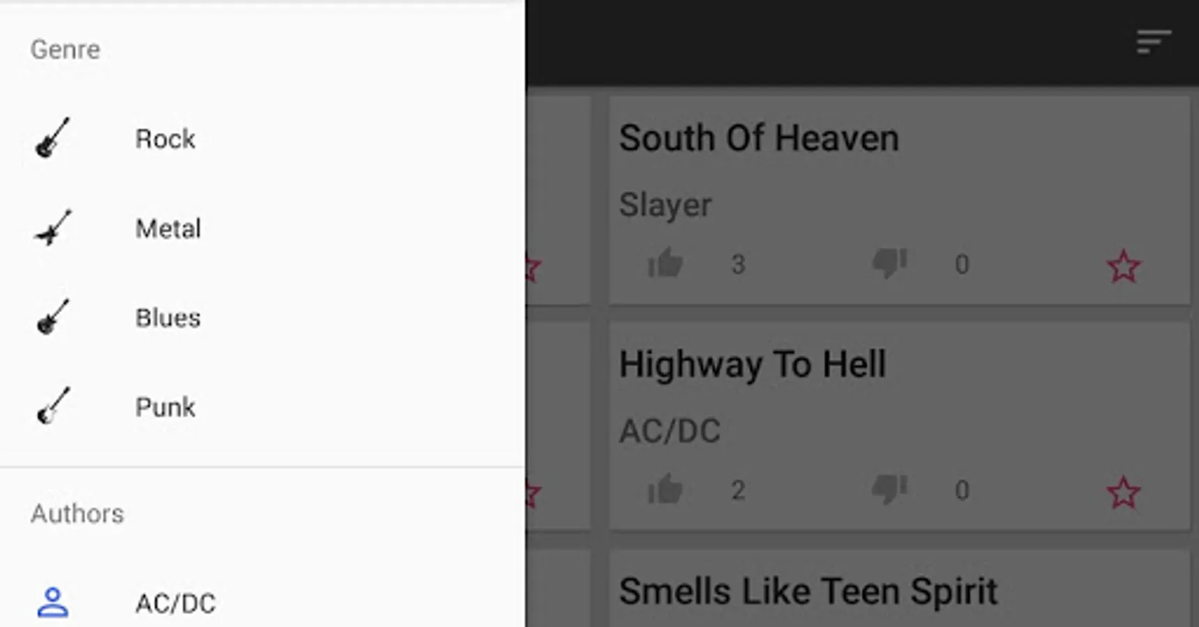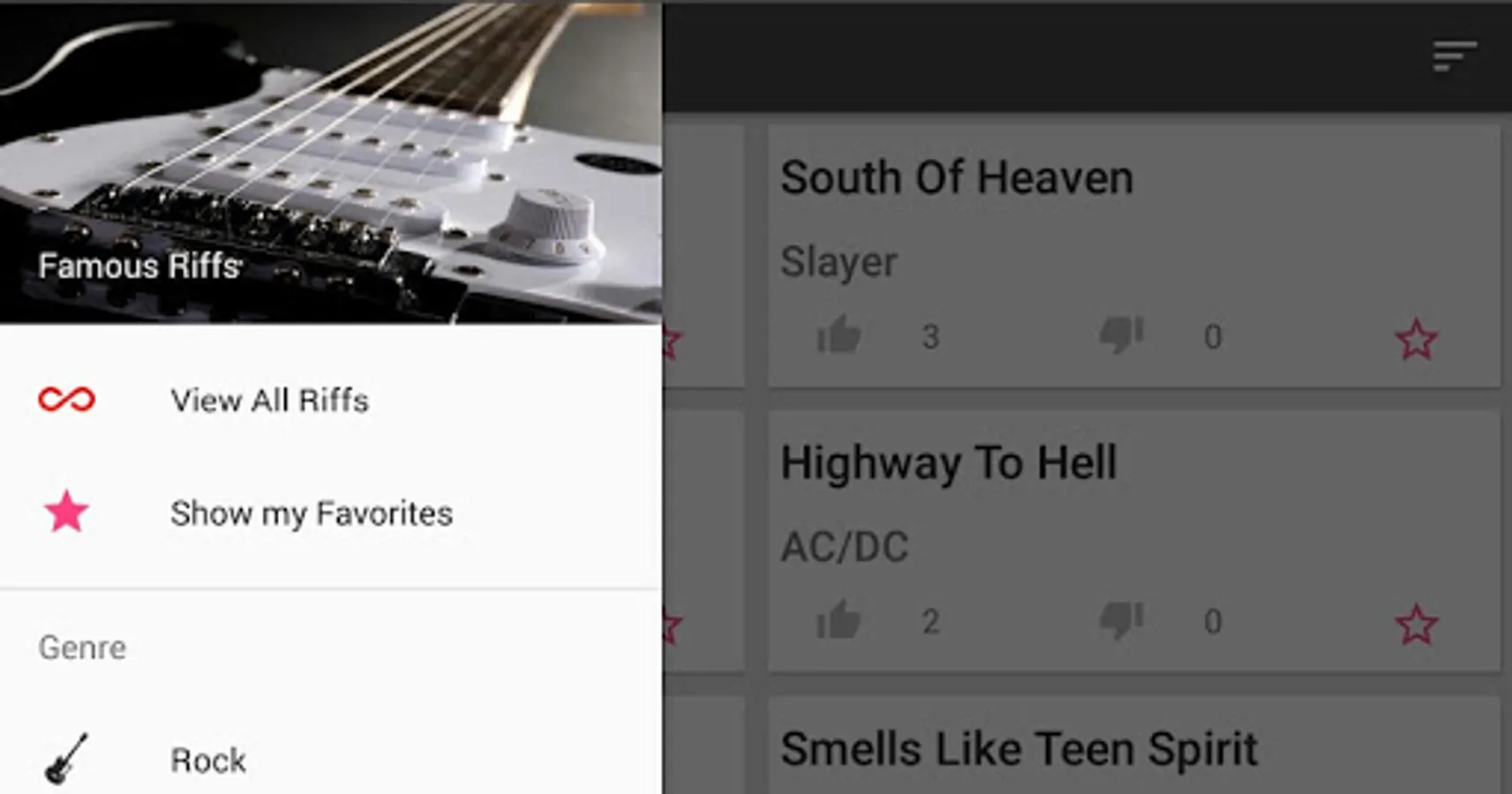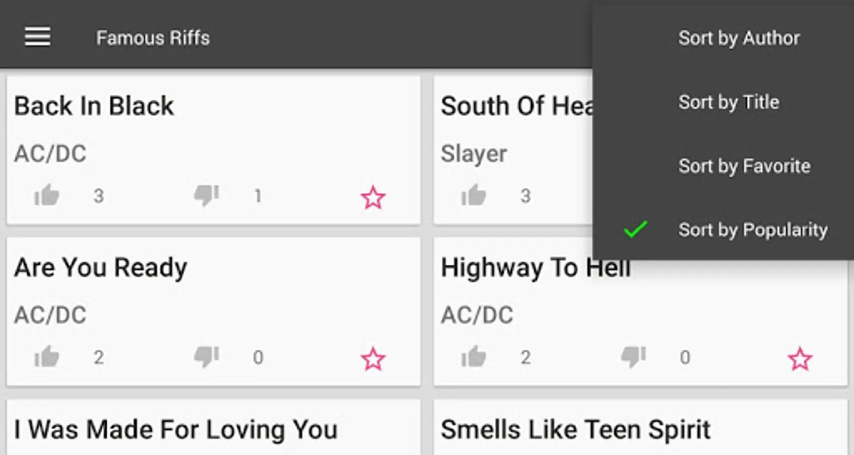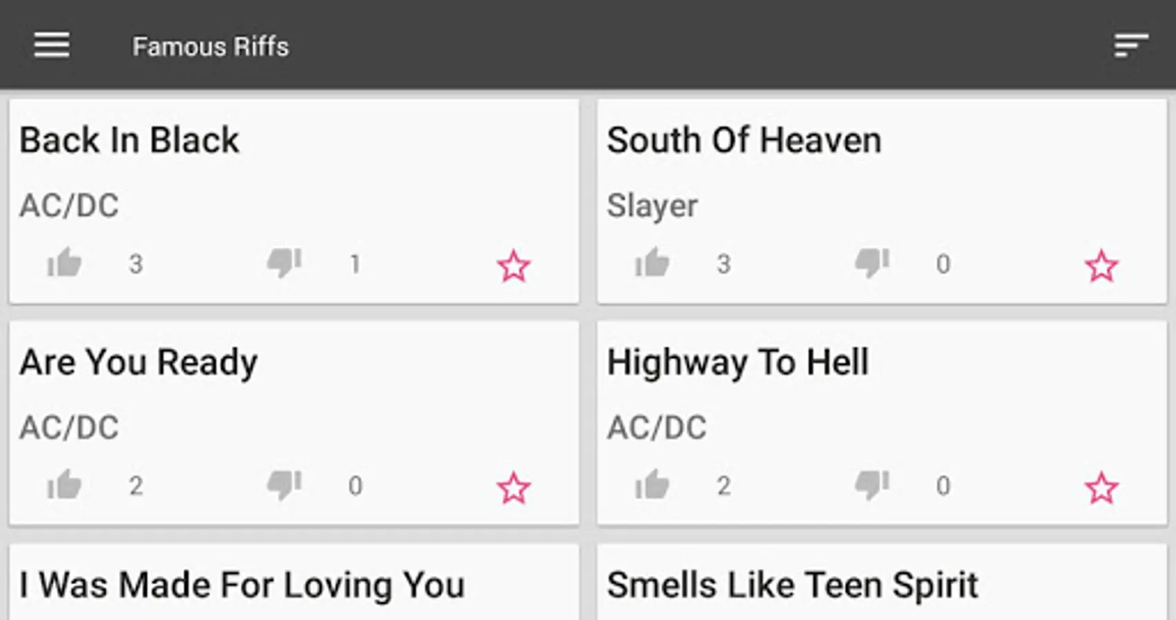 FamousRiffs is app containing more than 150 the most outstanding rock and metal guitar riffs such artists as AC/DC, Metallica, Megadeth, KISS, Judas Priest, Ozzy Osbourne, Scorpions etc. It is perfect for beginner guitarists, because it contains quite simple riffs. Contains guitar riff tabulature and audio, as well as description of the song.