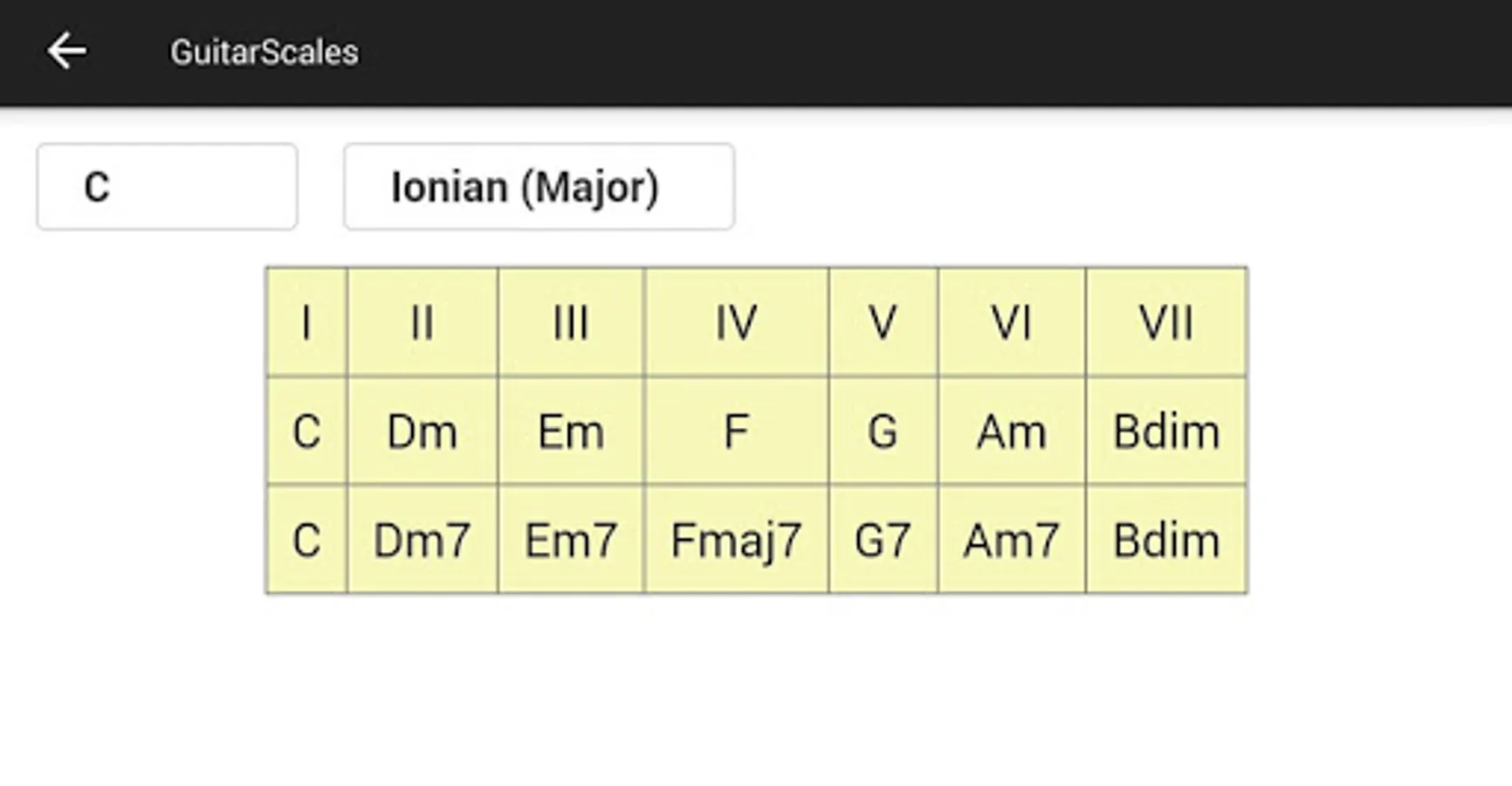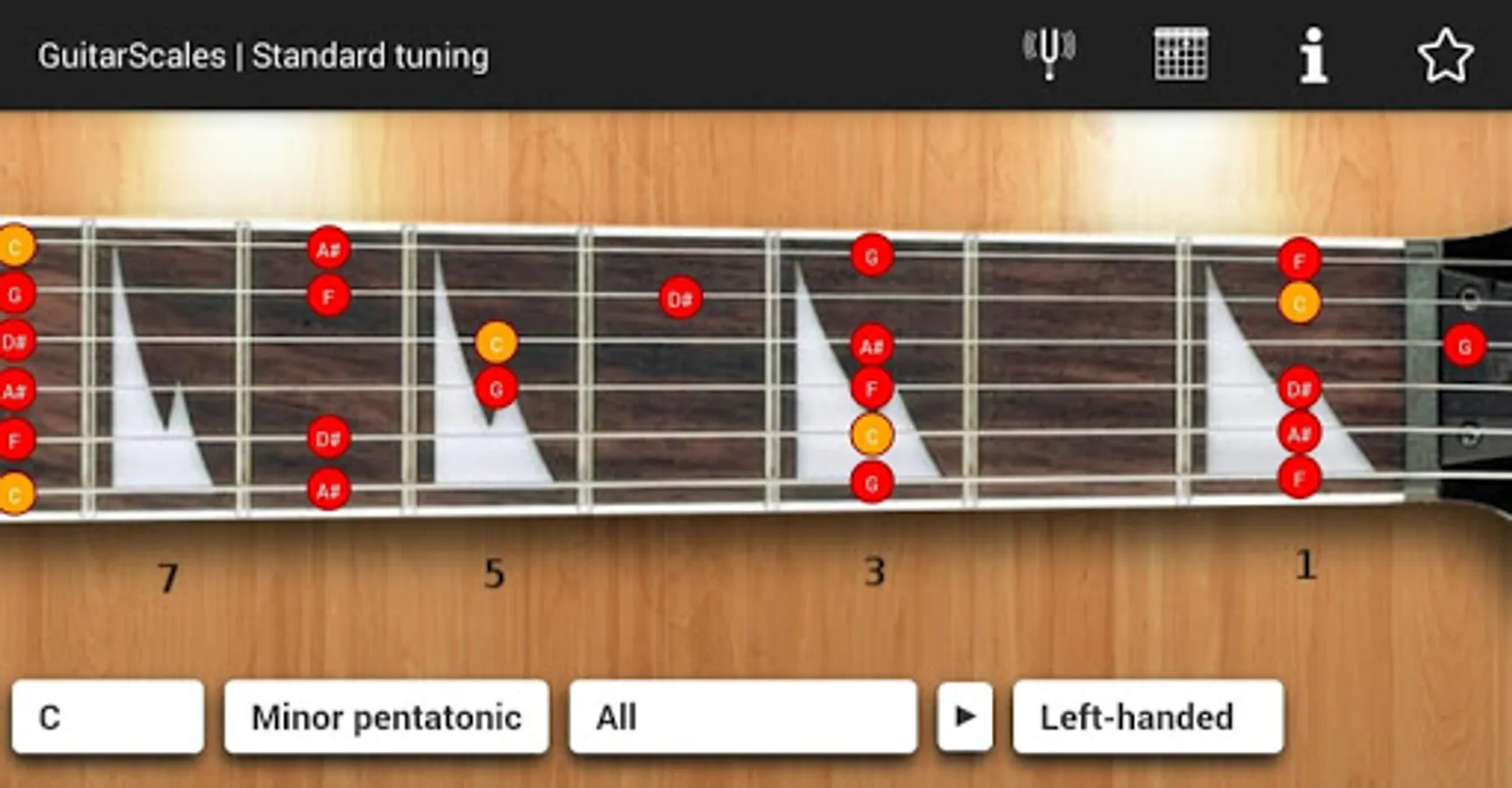 is a free android application for learning guitar scales and memorize the notes on the guitar fretboard. It contains chromatic, Ionian (major), harmonic major, Dorian, Phrygian, Lydian, Mixolydian, Aeolian (minor), Locrian, harmonic minor, major pentatonic, minor pentatonic, blues pentatonic, Hungarian Gypsy, Ukrainian Dorian, Acoustic, Persian, Algerian, Flamenco, Hawaiian, Chinese, Byzantine and Neopolitan scales.