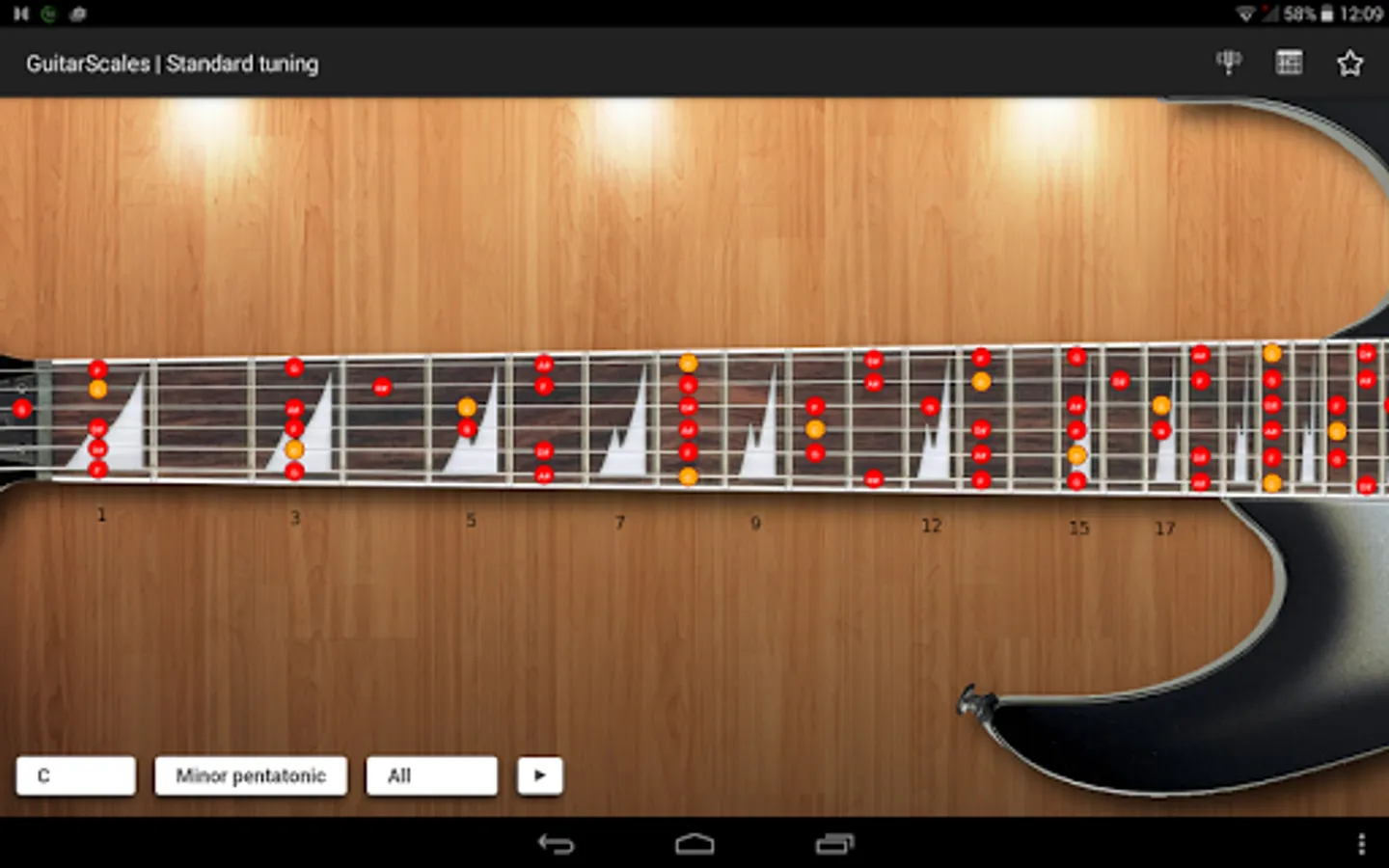 Highlight the whole fretboard to show which notes are within a chosen scale and some positions (5 positions, 3 notes per string positions, diagonal positions) for each scale. Containing examples of the sound of scale and notes sounds. Optimized for all devices and tablets.