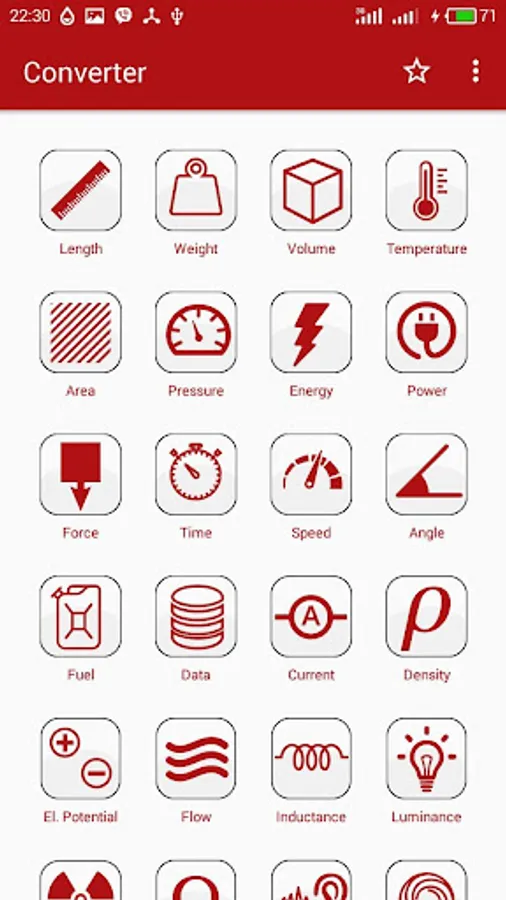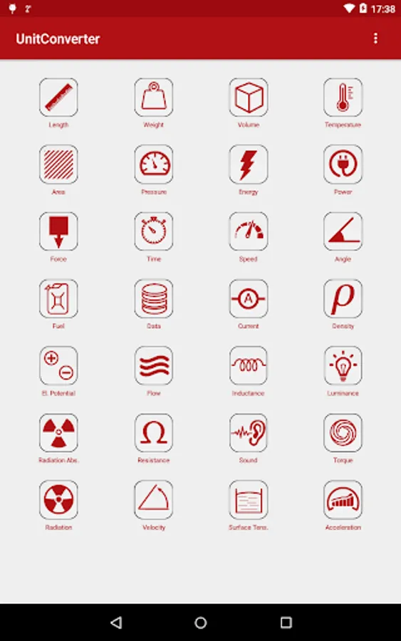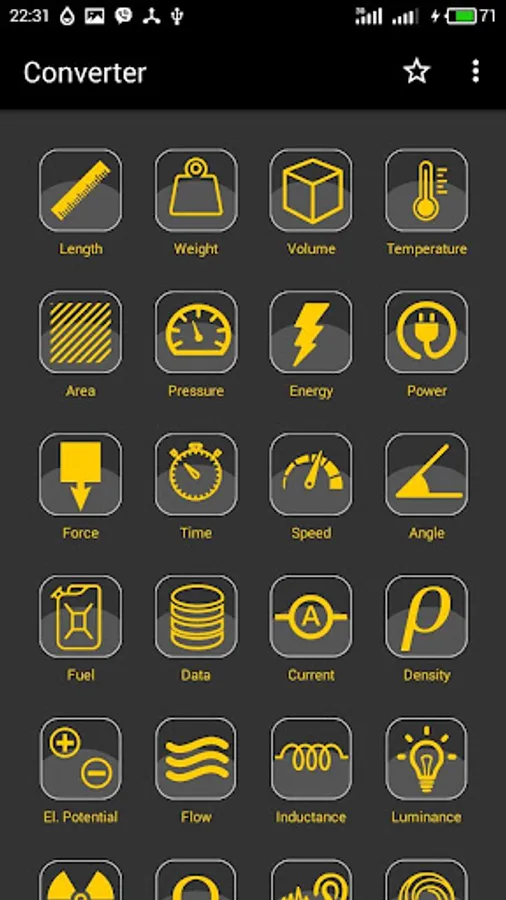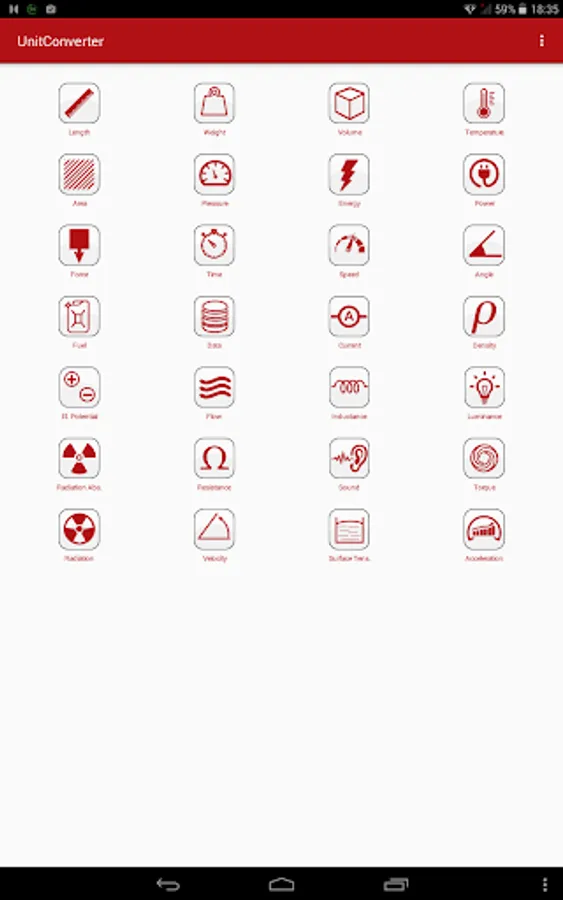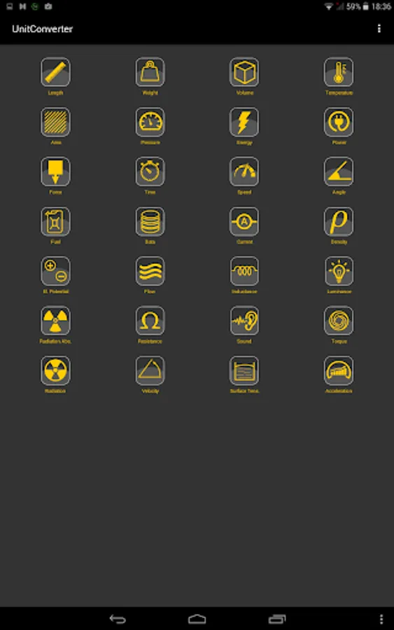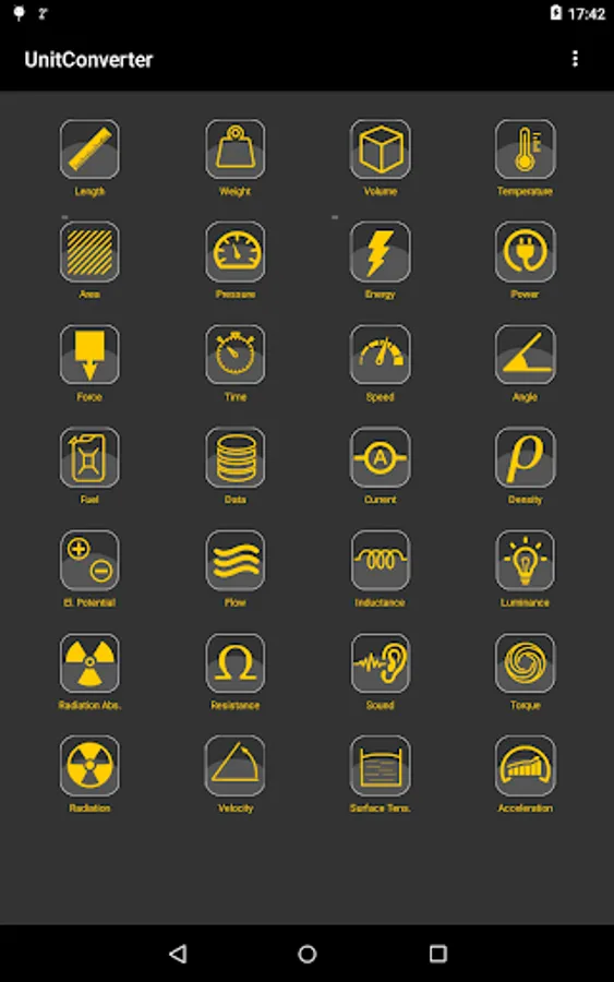 the application converts such units as length, weight, volume, temperature, area, pressure, energy, power, force, time, speed, angle, fuel, data, current, density, electrical potential, flow, inductance, luminance, radiation, resistance, sound etc.
