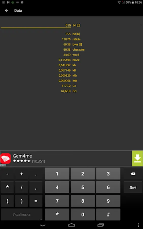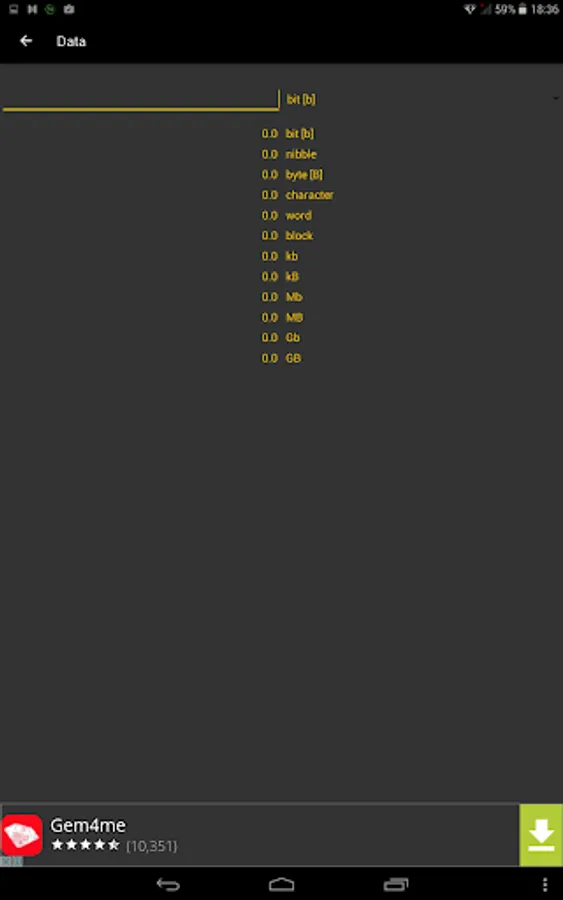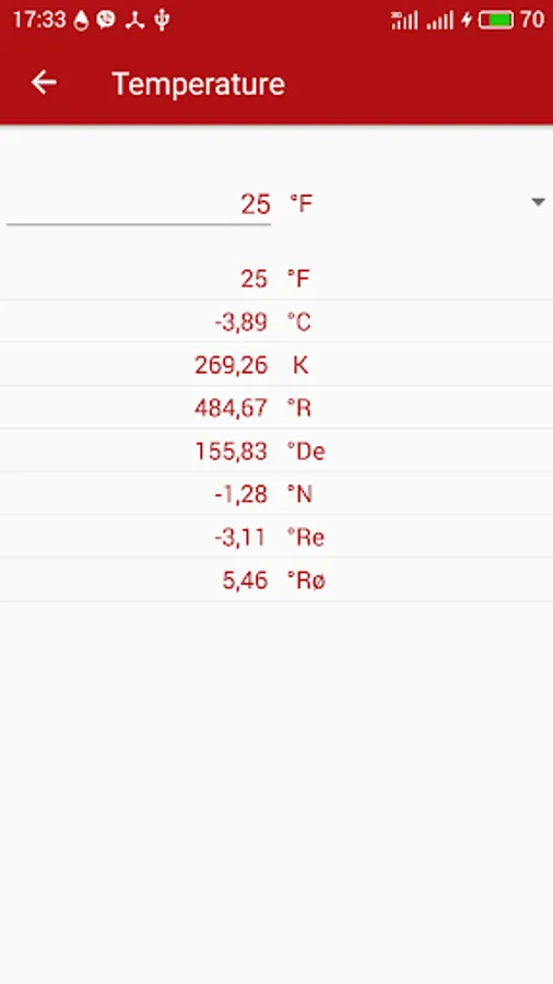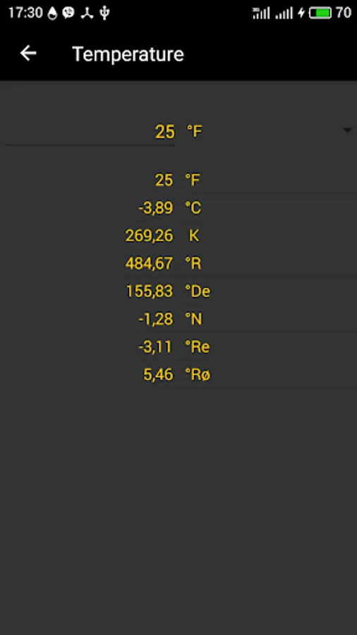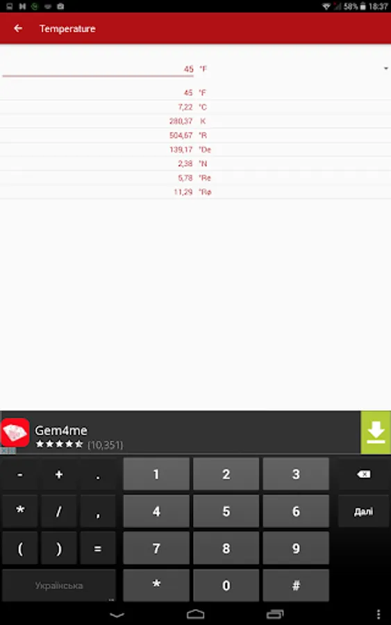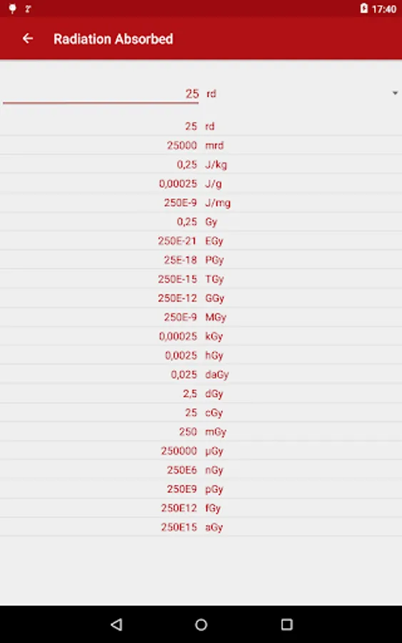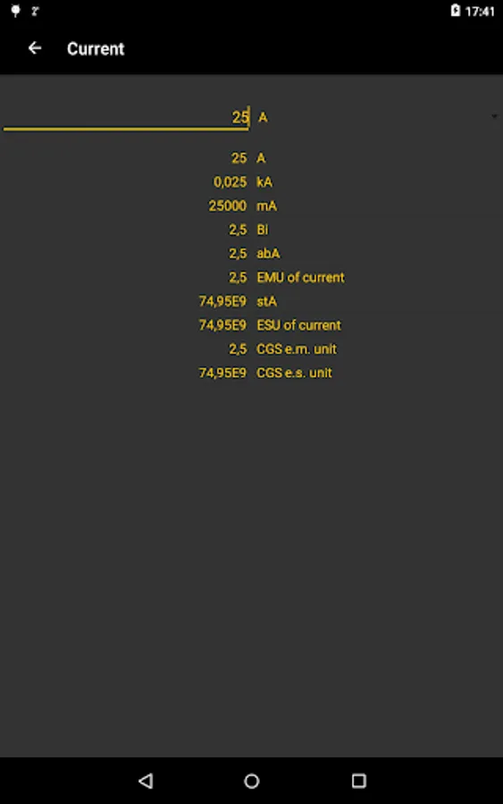 the application converts such units as length, weight, volume, temperature, area, pressure, energy, power, force, time, speed, angle, fuel, data, current, density, electrical potential, flow, inductance, luminance, radiation, resistance, sound etc.