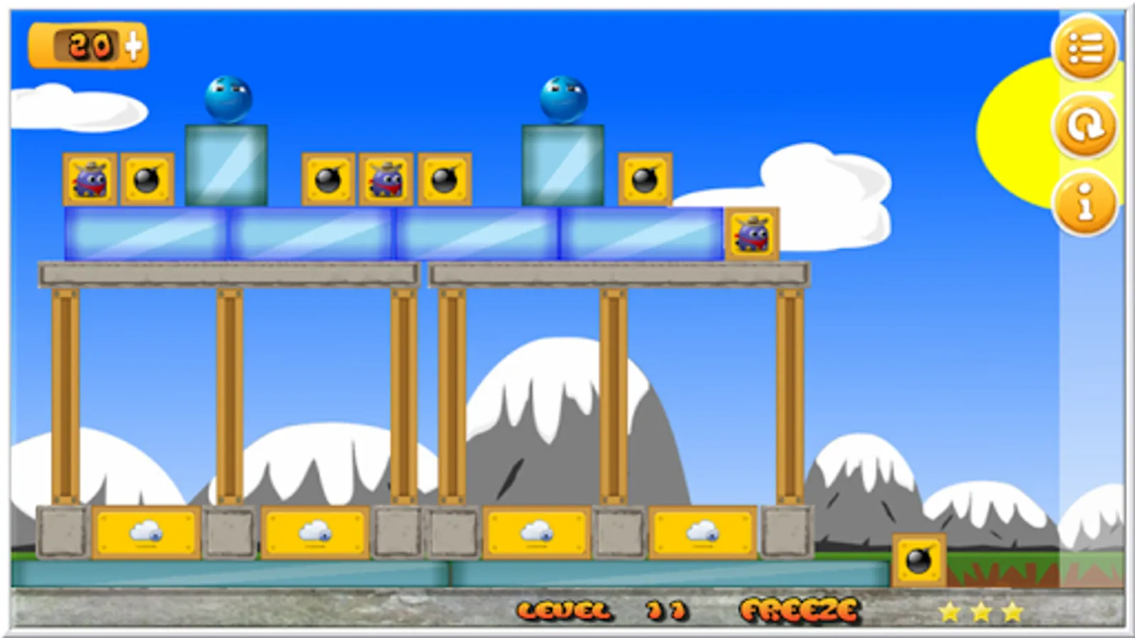 Jump from box to box, destroy the boxes or fly over them with the explosion, you must carry the ball home. In the end, only one box should remain.