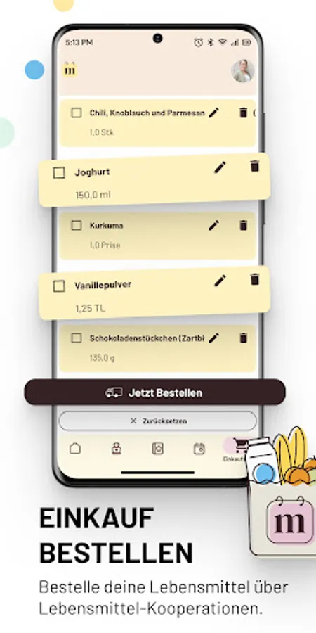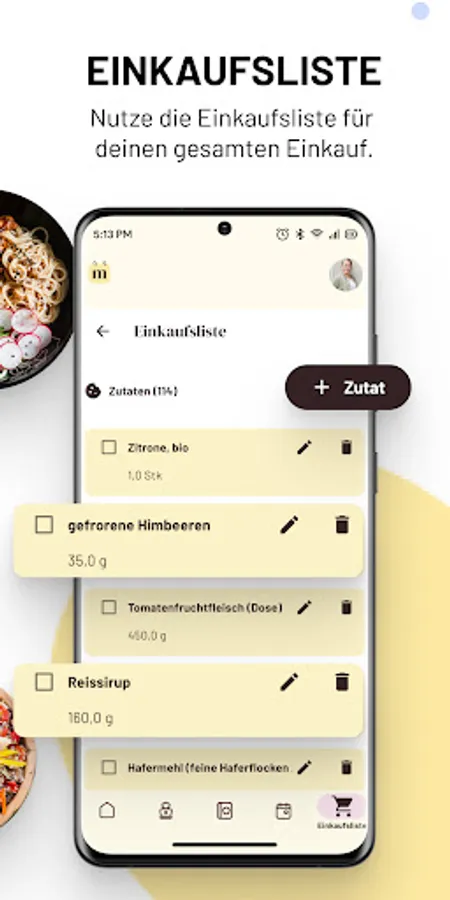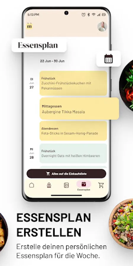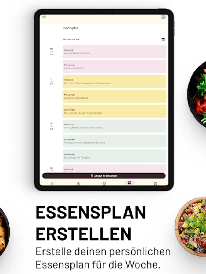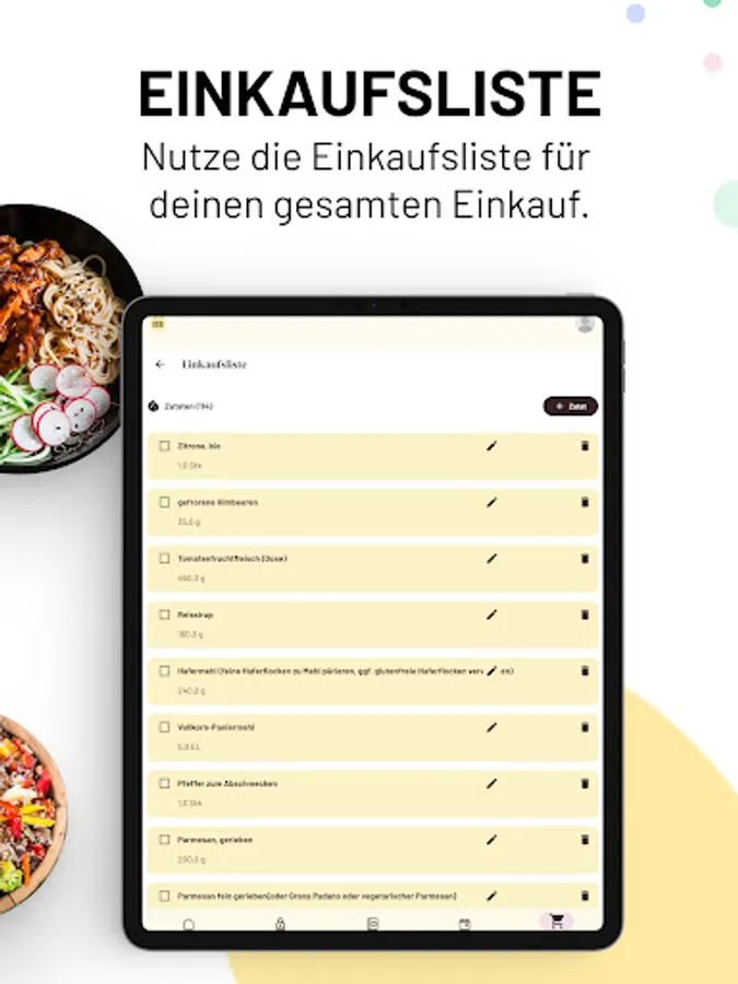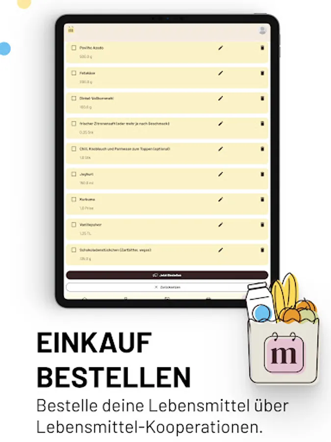 Als nächstes erstellst du dir aus deinem Kochbuch den Essensplan für die nächste Woche. mealify stellt dir eine fertige Einkaufsliste zur Verfügung inkl. Frühstück und Snacks. Selbstverständlich kannst du deine Einkaufsliste noch mit weiteren Items ergänzen – wie Zahnbürsten oder Waschmittel.