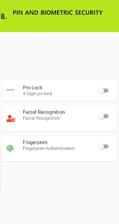 1) Biometric data security using fingerprints, facial recognition, and PINs