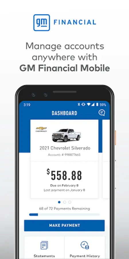 The GM Financial Mobile app lets you manage accounts anywhere. The February 2019 update addresses many of the performance issues that were in the initial version of the app, while also featuring a new look, improved navigation and fingerprint authentication.