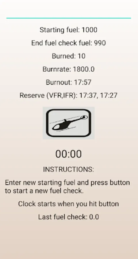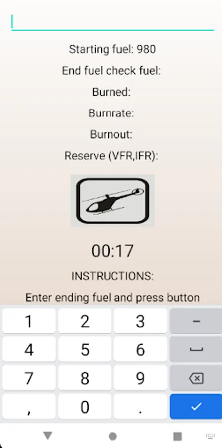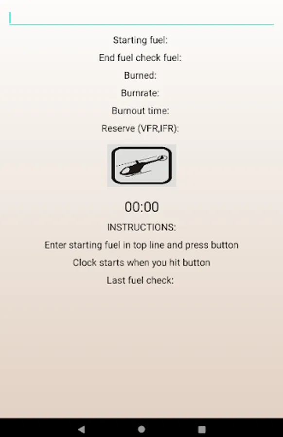 Allows the user to input current aircraft fuel reading, start a timer, and end a timer by giving your final readings. The Application then automatically calculates the amount of fuel used, fuel burn rate per hour, time you will be at 0 fuel, and 20 and 30 minute reserve times, and displays them on the screen for the user. Designed as the first android application I built, but it does the job.