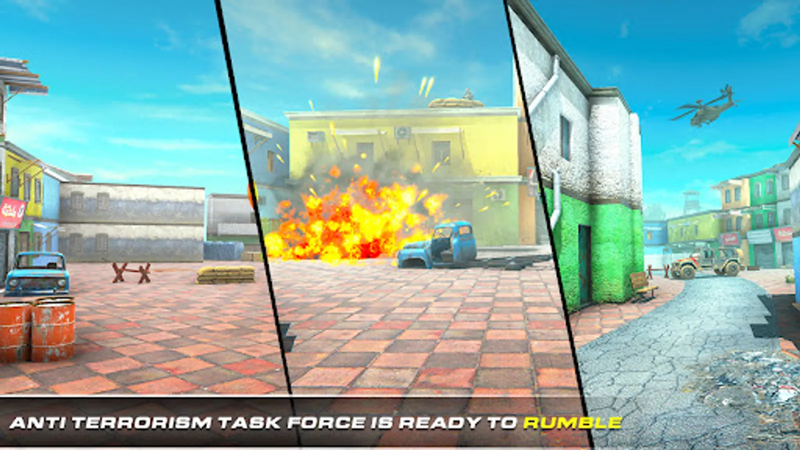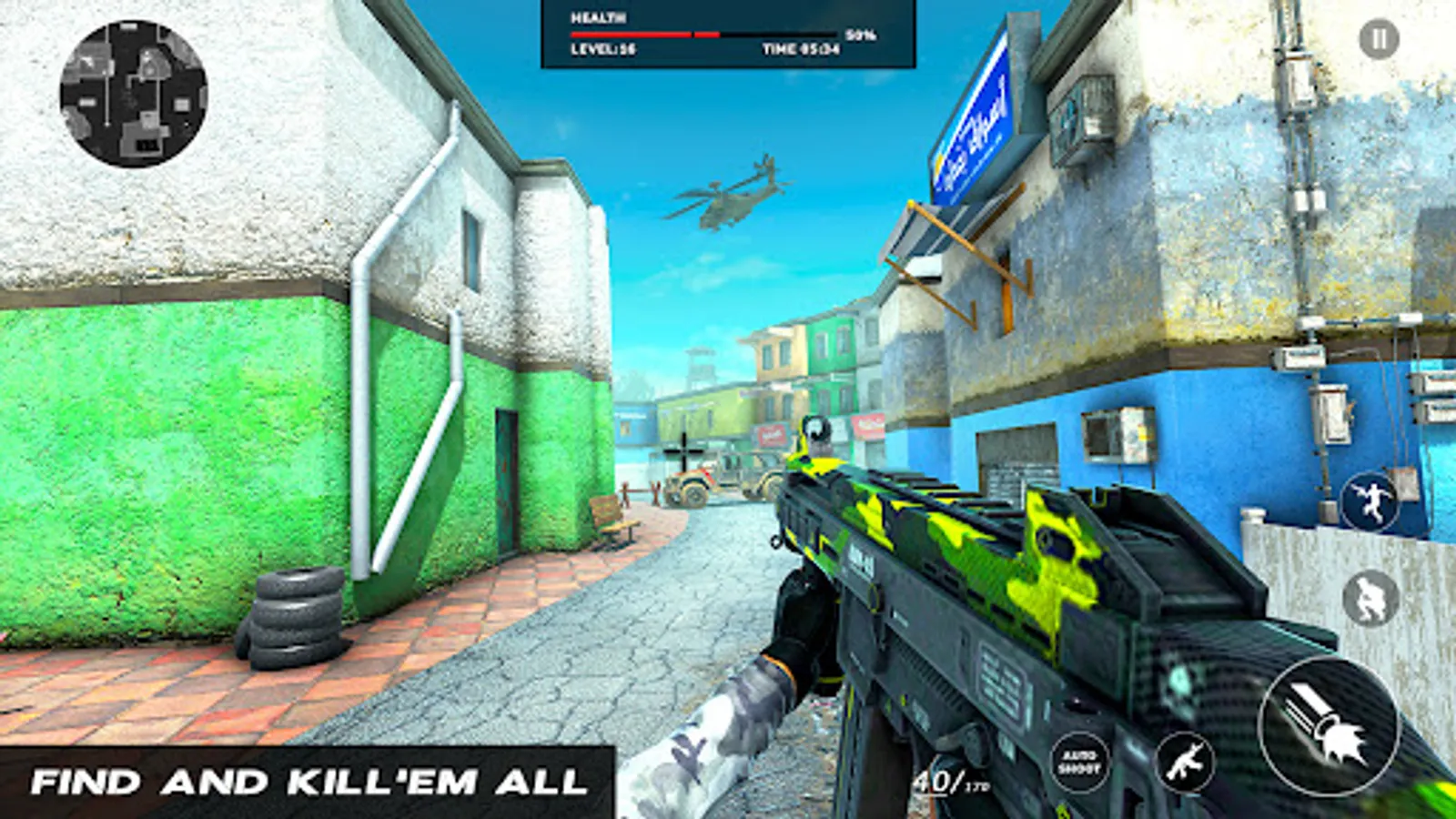The gunshot games simulator boasts high-tech weapons for commando action shooting missions. Master shooting skills, using reloads, jumps, and more. Enjoy FPS shotgun sound simulations with superior gun shooting. Deploy commando machine guns, snipers, bazooka, tanks, humvee, and helicopters against terrorists.