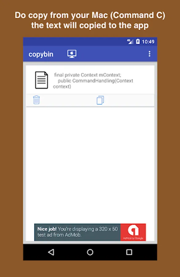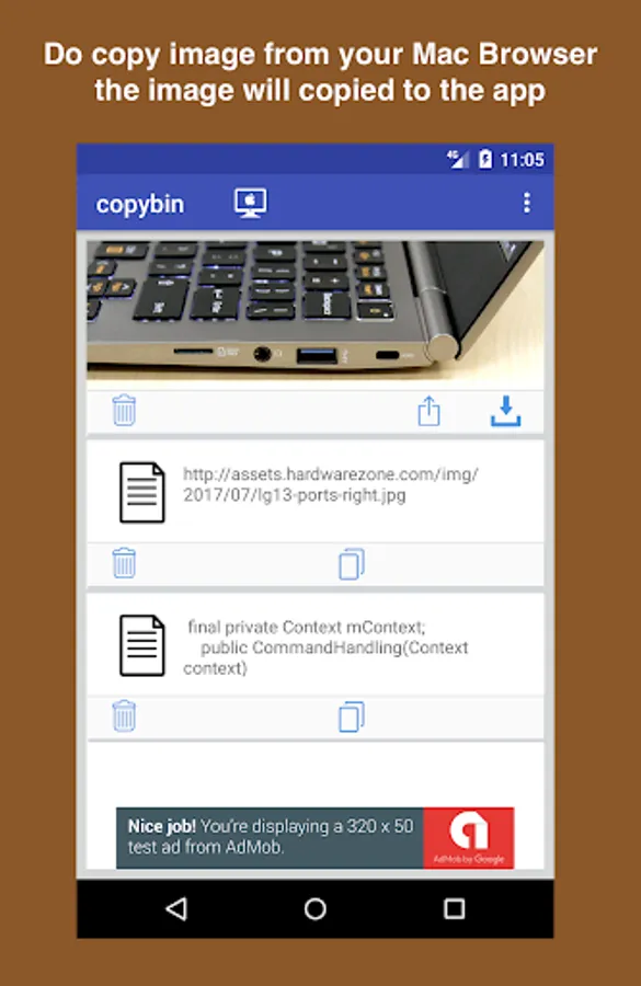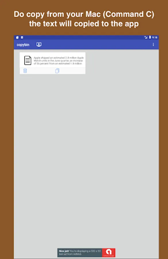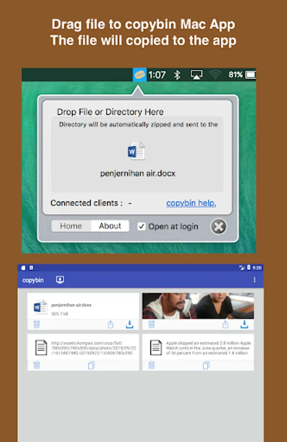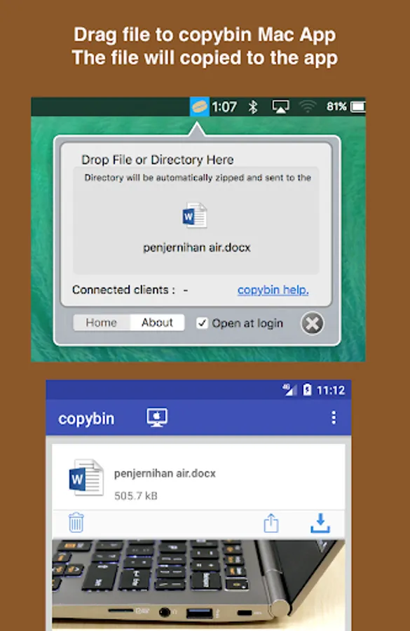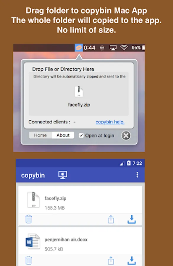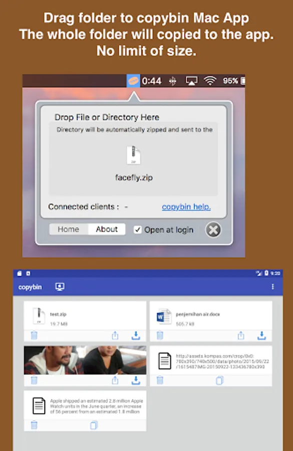 From desktop OSX, drag any file to copybin and the file will be transferred to Android, iPhone or iPad. Drag folder will automatically zip the folder and send to IOS device (as quick backup).