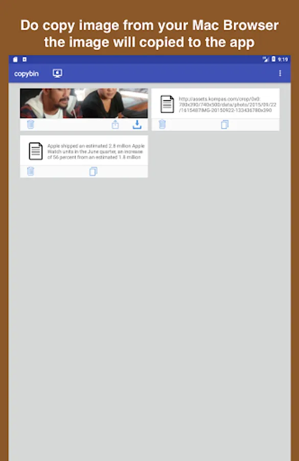 • App is able to preview image, text, movie, pdf, movie, and other file. Big size movie file will be transferred with easy, from your mac, to copybin, and to your fav movie viewer such as VLC.