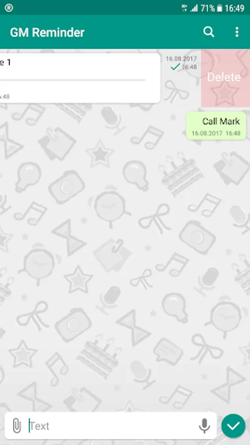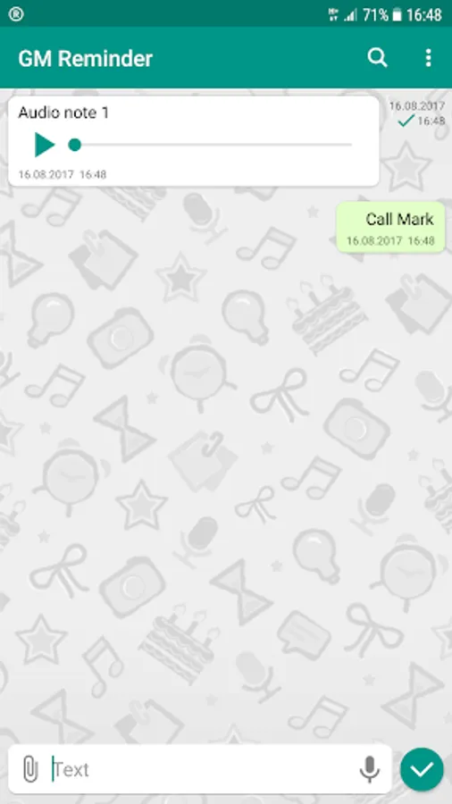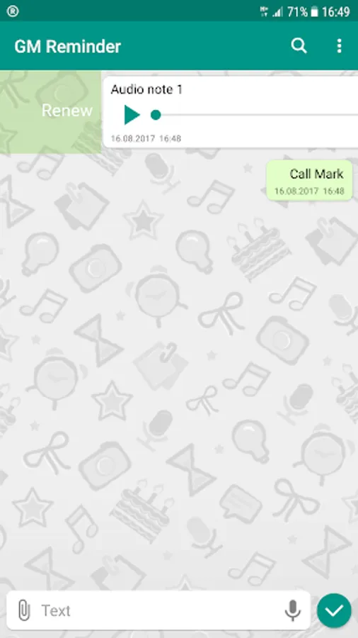 It is often necessary to create a quick note or a reminder in order not to forget to do something. There are a lot of applications allowing to create reminders but often it cannot be done quickly. Usually for creation of reminders it requires to choose date, time and some additional options which significantly slows the process down. The GM Reminder application is intended for quick creation of reminders. It is very easy to handle it and takes you minimum taps. You do not need to fill a number of different fields. It requires only information not to be forgotten. All reminders are added to the system notifications area so you will never miss them.