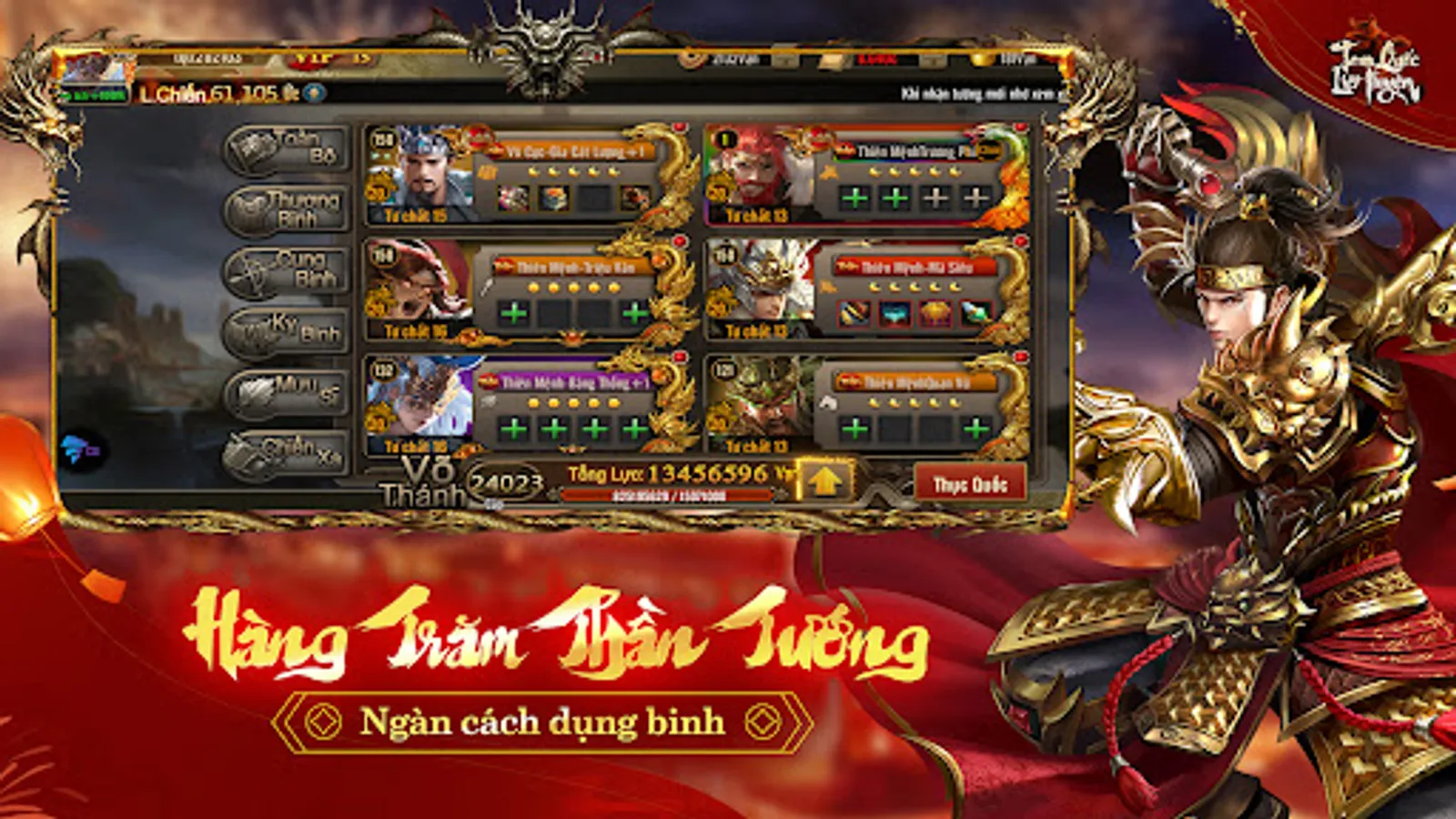 - 130 generals, 7 branches, 7749 ways to use troops: All characters are researched and sketched by the game team in a 1:1 ratio just like the prototype. Besides, based on the original story of "Three Kingdoms Dien Nghia", the game development team has diligently researched the unique infantry forces in Chinese history, especially the principle of countermeasures between the armed forces. bring the most authentic feeling to the product.