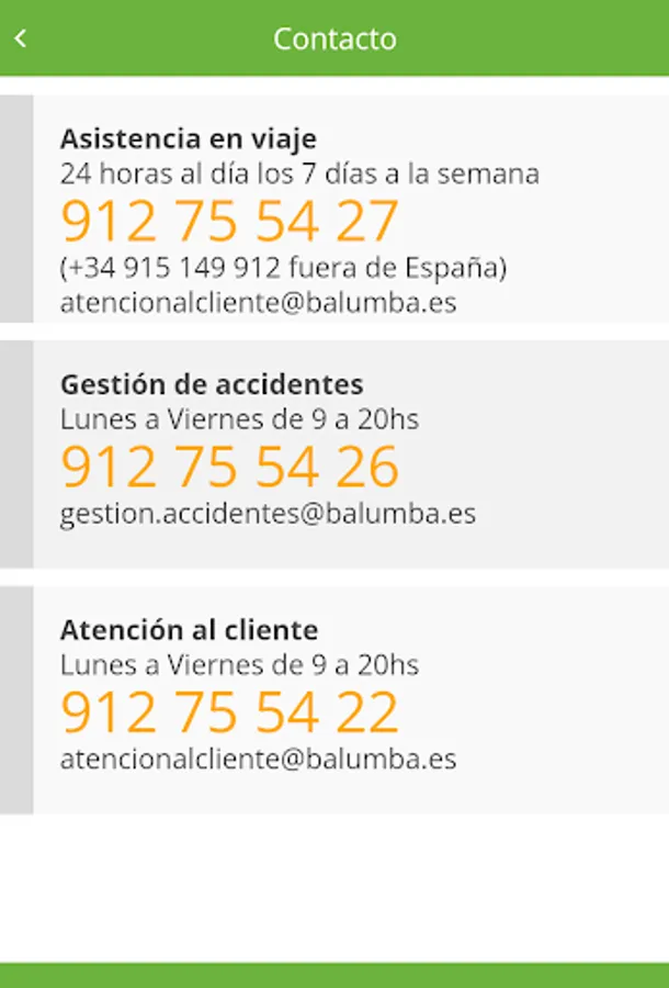 Self-verify your vehicle or send photos or documentation related to your accident quickly and easily thanks to the explanations that will guide you throughout the process. The application allows you to take pictures of your vehicle from the mobile device and send them directly to the department in charge of processing the verification or your accident. This application also shows the email addresses and contact numbers of the main departments of Balumba Seguros. With the mobile phone above you can always know how to contact our Travel Assistance, Accident Management or Customer Service departments. In this way, it becomes an essential application for the Balumba Seguros client, having his office in his own pocket. Both the download and the use of the application are totally free.