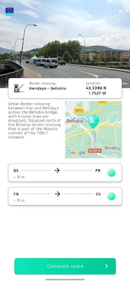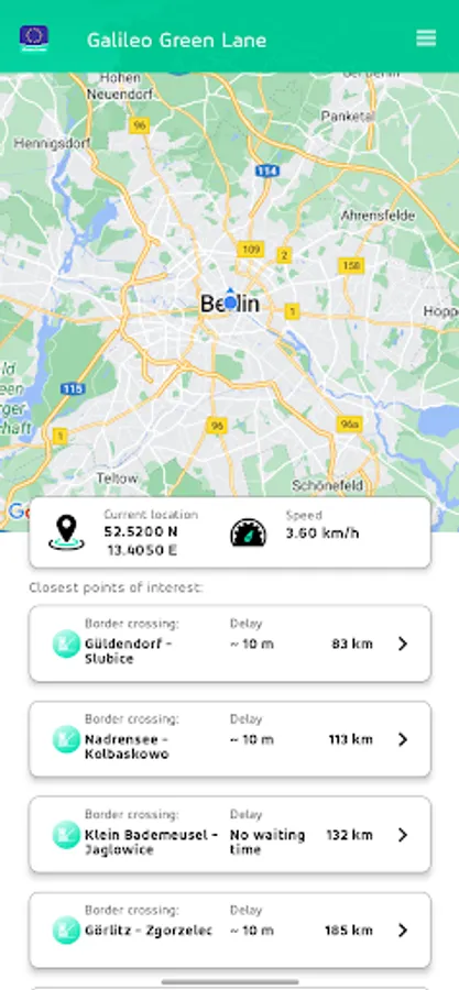 The enhanced Galileo Green Lane app uses your device’s location to show the closest border crossings and other points of interest. It also collects location data to measure the traffic status at TEN-T border crossings. Location information is transmitted securely and anonymously to our servers only when you enter a TEN-T border crossing zone to provide statistical traffic data.