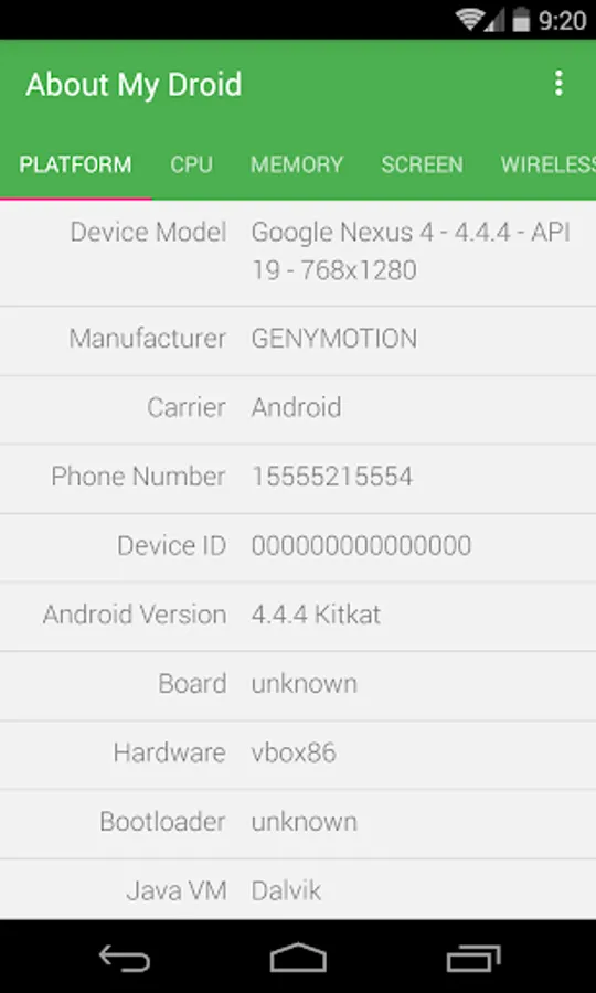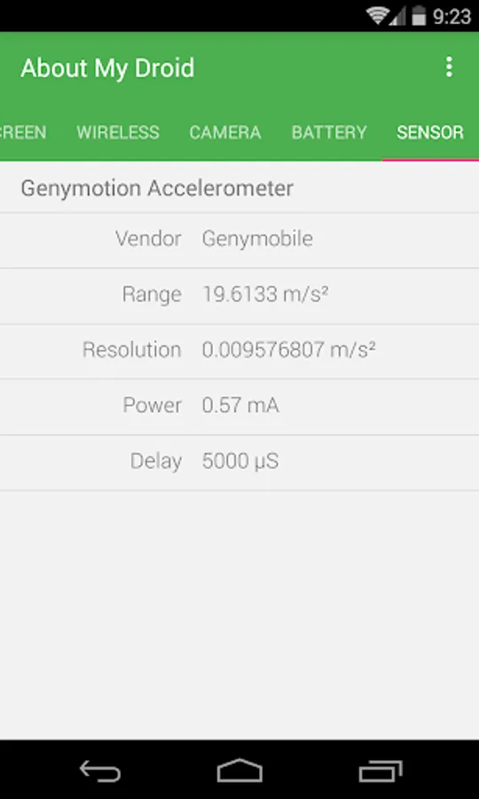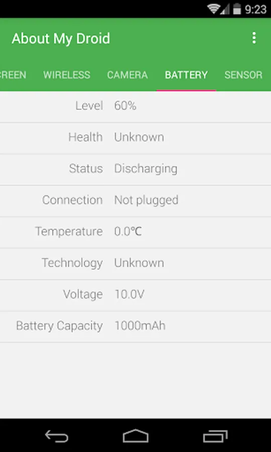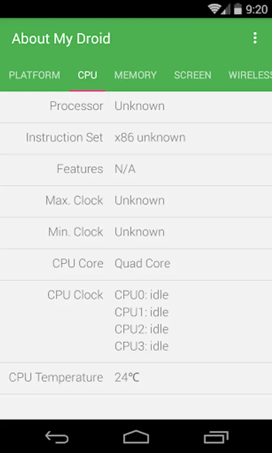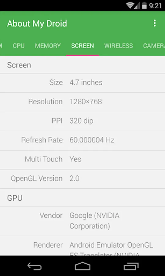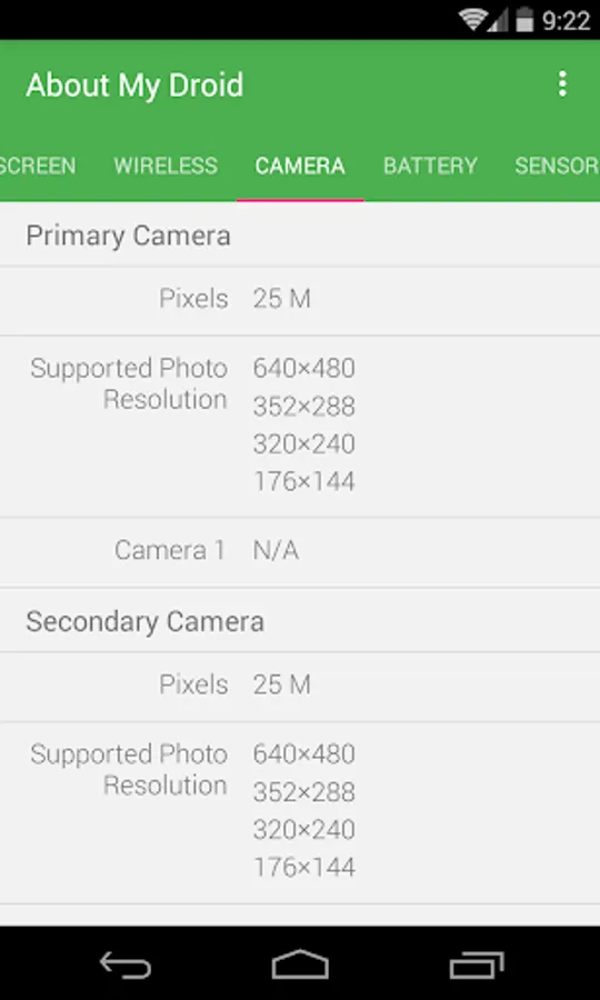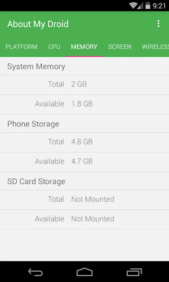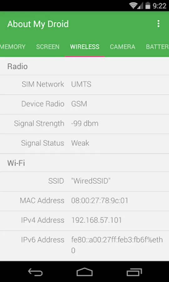 About My Droid is a very light weighted app that presents everything about your Android device including system, CPU, screen, storage, camera, battery, wireless technology and sensors.