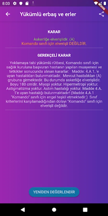 By means of the application, the diagnostic substances in the regulation can be easily identified and the decision on the availability of soldiers can be made in a practical way. The health adequacy of the military personnel can also be assessed through practice.