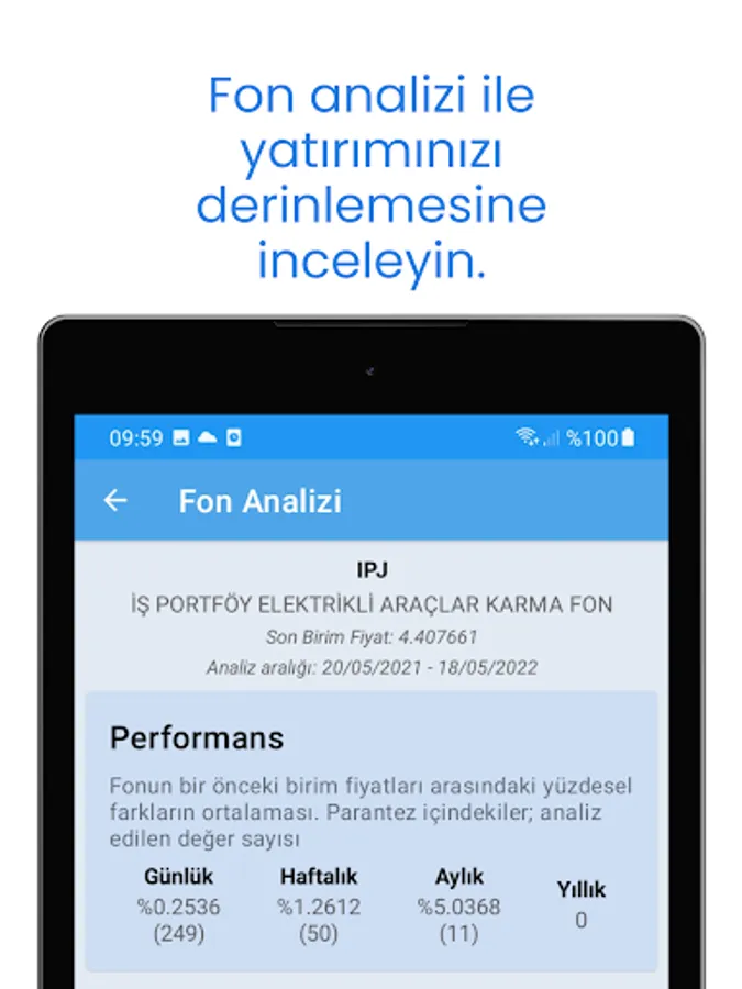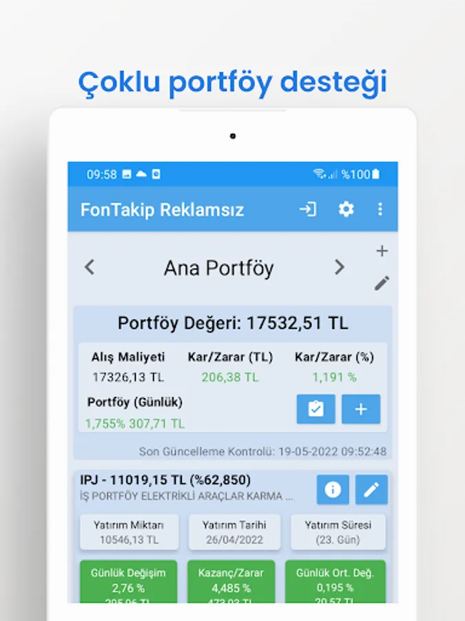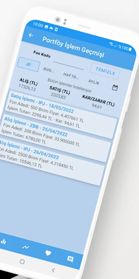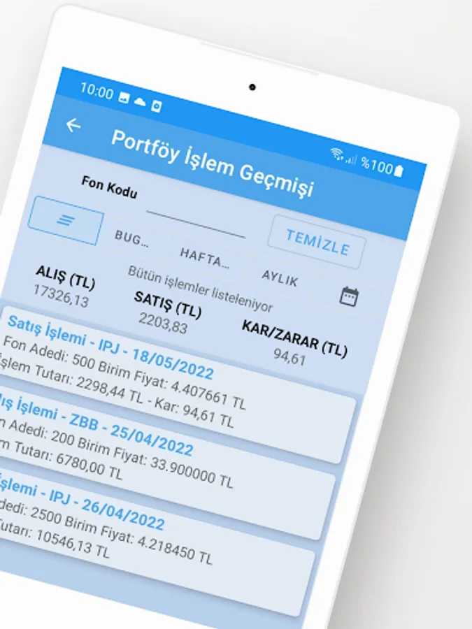 By creating multiple portfolios, you can track the daily or total return, profit or loss rate and value of funds and portfolios separately, you can see your average cost after fund purchases and transactions, and your gross profit after sales transactions. In short, you can follow your investment accounts through a single application.