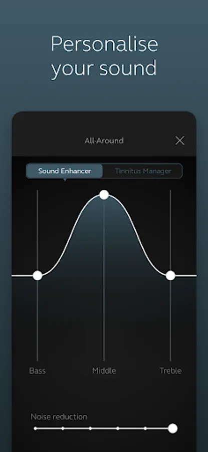 • Tinnitus manager: Adjust sound variation and frequency of the Tinnitus Sound Generator. Select Nature Sounds (feature availability depends on your hearing aid model and the fitting by your hearing care professional)