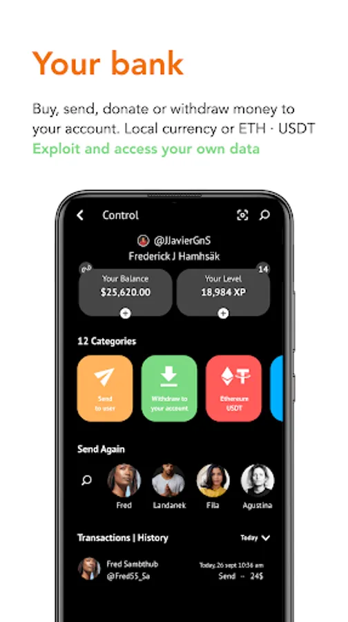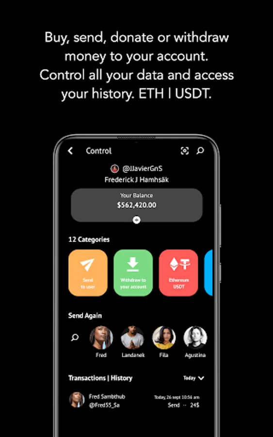 In the control section, you can see all your history of purchases, sales, transactions and withdrawals to a bank account. You can buy and sell products or services in fiat money, Ethereum, USDT or other currencies. Users can create NFTs and send or donate crypto ETH, USDT, etc.