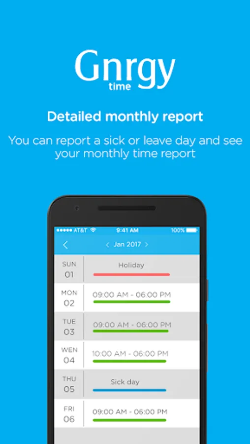 The app lets employees check in/check out and keep track of their own working hours. Employees can also report historic check in/out as well as a sick day or leave day.