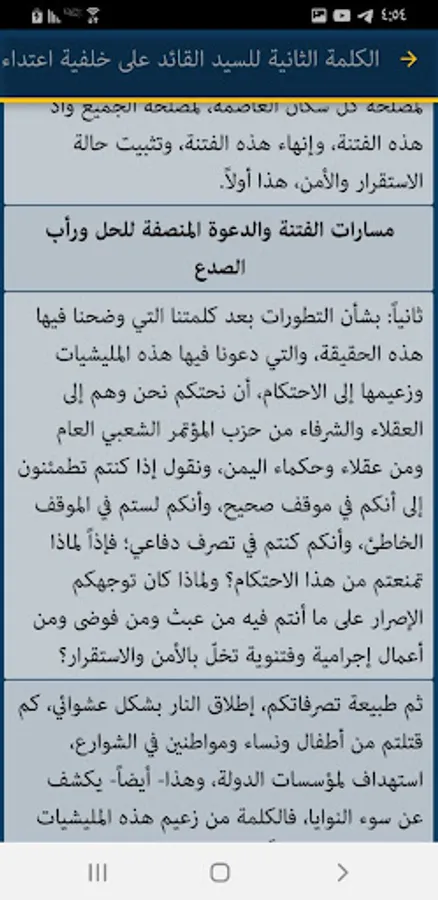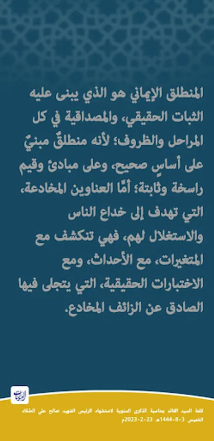 As for after.. May God Almighty grant us success to produce this application, which contains evidence of the guidance of God Almighty, through what was presented by Mr. Commander Abdul-Malik Badr Al-Din Al-Houthi, may God preserve him in his words, lessons and speeches, in front of various events and political and military challenges... and others, And in the various local, regional and international arenas, in a way that meets many of the faith, educational, awareness and cultural requirements of the nation, and with regard to the central issues of our nation such as the Palestinian issue, and restores the nation to adhere to its basic foundations and important principles, and contributes to addressing many of the nation's social and economic problems... and others, In a way that helps in the advancement of our nation and building its civilization on the basis of the guidance of God Almighty.