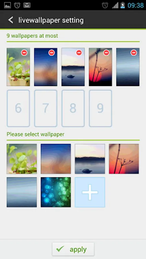 3. To show the multiple wallpaper effect, please make sure your launcher surpports wallpaper scrolling(GO Luancher EX: menu - wallpaper - Display mode - Default mode)