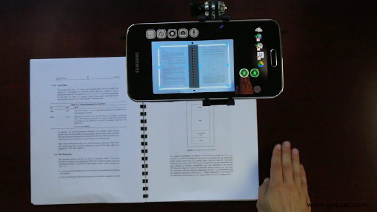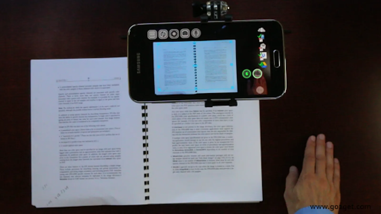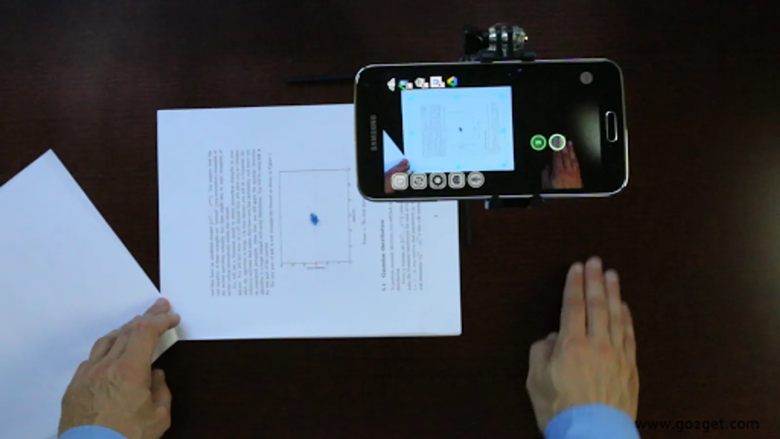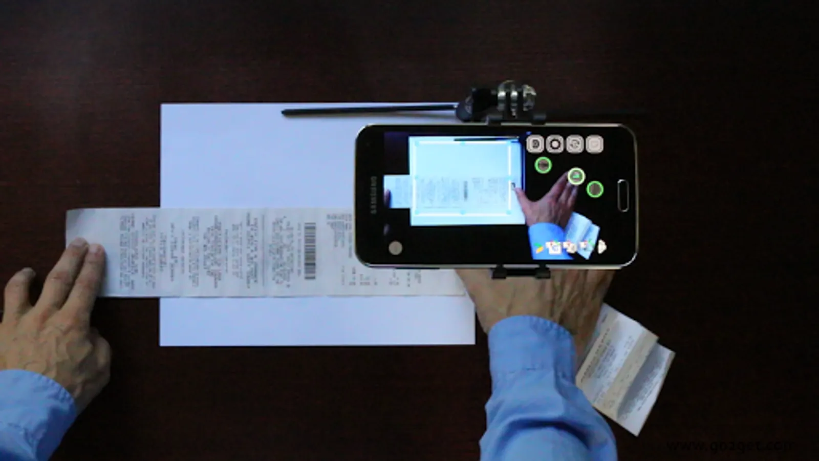 Having both hands free, enhanced by Augmented Reality buttons, lets you hold and scan stapled documents, folded receipts, books and magazines and even add voice remarks without touching the phone.