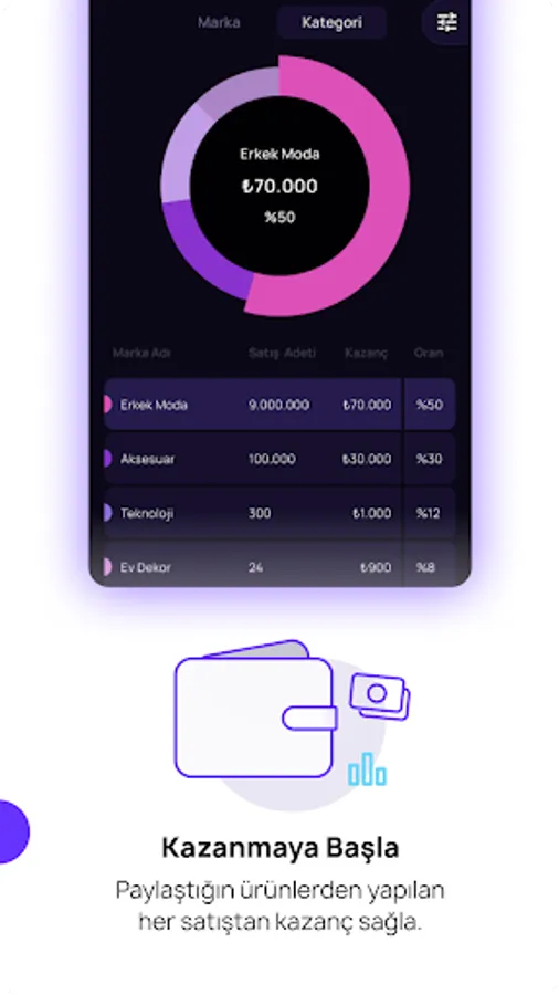 With this platform prepared specifically for influencers, an environment where you can easily find dozens of brands and take quick and simple action awaits you. This platform, where you can share appropriately with your target audience, does not involve you in any negotiation process with brands, allowing you to interact directly with your followers in any channel you wish. You can share a collection, product or brand link within the application and follow your earnings whenever you want.
