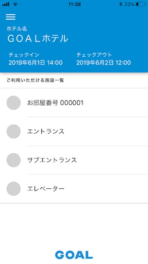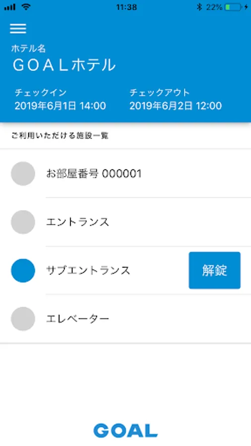 BLE hotel lock / GOAL is an application that uses BLE equipped smart phone as a room key of BLE compatible hotel lock (made by GALL).