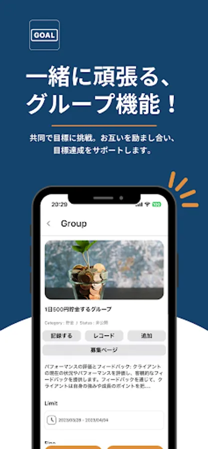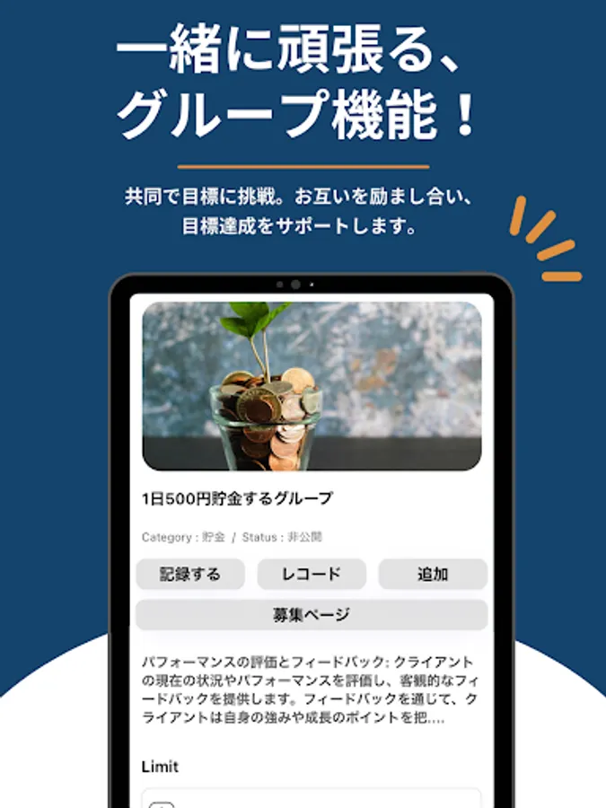 2. Group: A function to challenge the goal with friends. Set action dates against common goals and complete tasks together.
