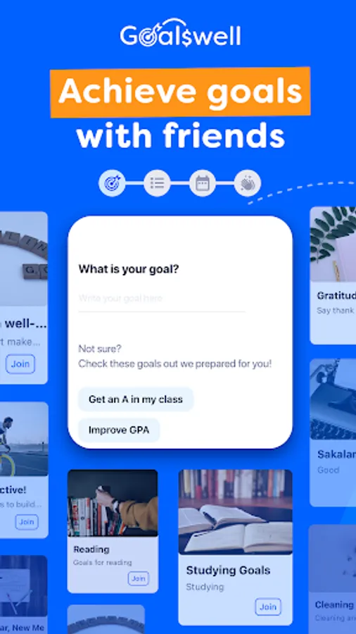 Goalswell is a FREE app that will train you to achieve your goals with your friends! No in-app purchases, no subscription, and no fees.