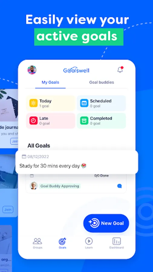 Goalswell is created to empower you to make healthy behavioral habit development through social goal setting. Aren’t you tired of setting goals that you then break due to a lack of motivation? If you would like to build new habits that actually work and will benefit your life, then try Goalswell!