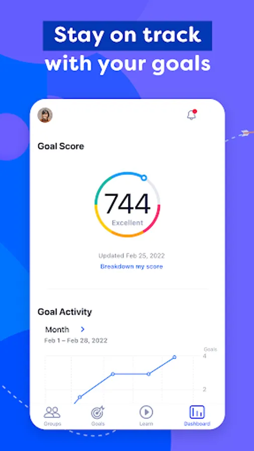 **GOAL SCORE** - Measure your progress! Like a credit score, we have built a tracker that calculates your goal score. With regular goal building and completion of goals, you can increase your goal score as you grow healthy habits!
