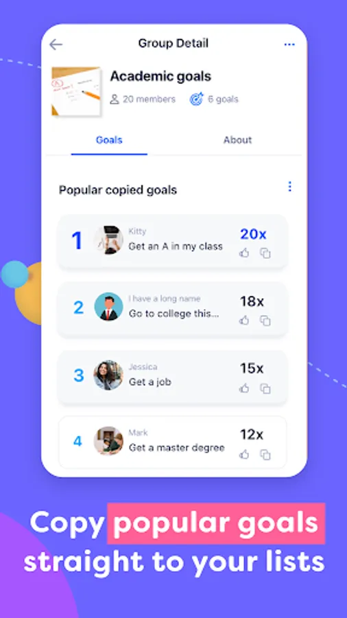 ** COPY CHECKLISTS ** - Check out friends’ or group members’ checklists and get inspired to action! Easily copy their goals and checklists into your to-do and work on tasks together.