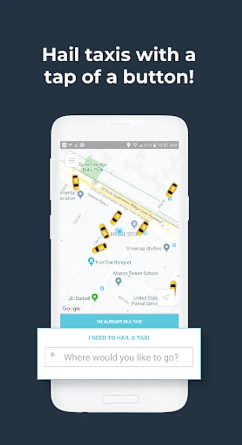 At the bottom of the home screen, tap the box labeled "I NEED TO HAIL A TAXI". Begin entering your destination in the box labeled "Where are you going?" and confirm from the list of destinations provided. You'll receive a fare estimate, route preview, and ETA of the nearest available driver. When you're ready to hail, tap "REQUEST RIDE" at the bottom of the screen to be matched with a driver. When the ride is over, the fare is paid automatically with the card on file or another payment method of your choosing.