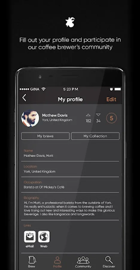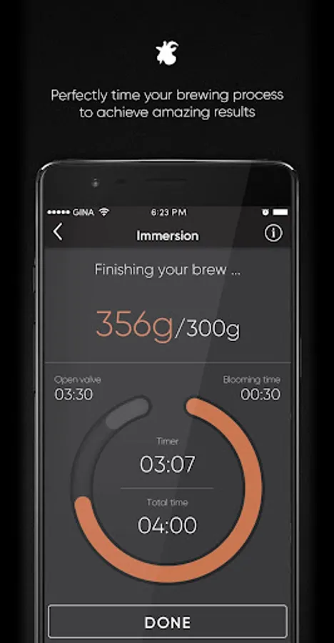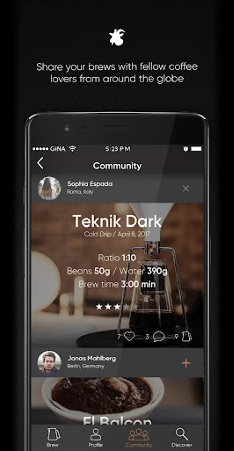 GINA's brewing app is home to a global community of coffee lovers as well as your new favorite smart tool for brewing coffee. The app guides you through the entire brewing process, keeping track of your timing and saving your brewing details as brew prints for sharing and later re-brewing. With the tools provided, you will certainly be able to brew your perfect cup of coffee and share your experience with other coffee enthusiasts from around the world.