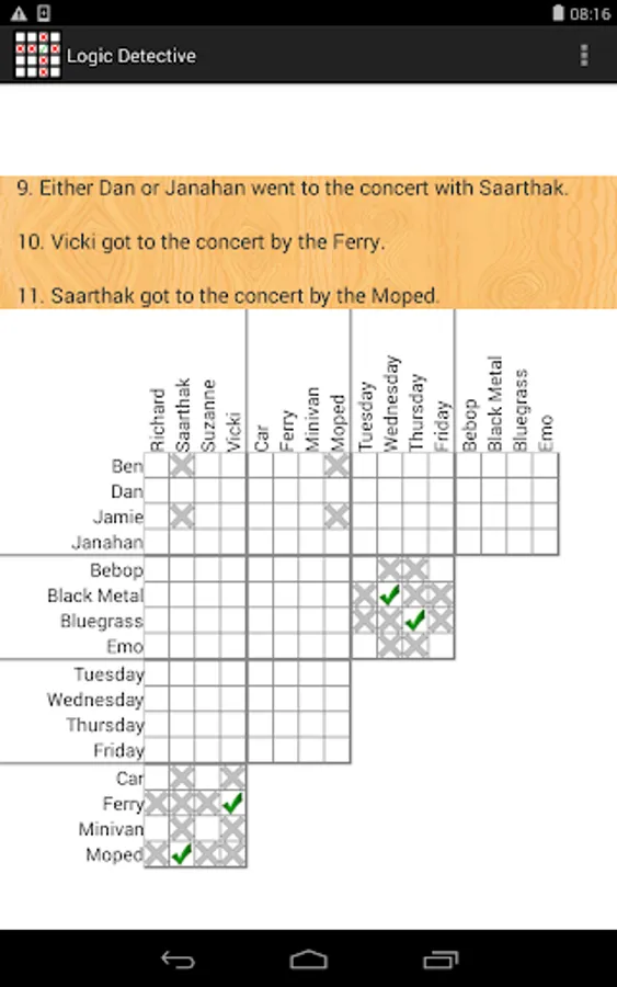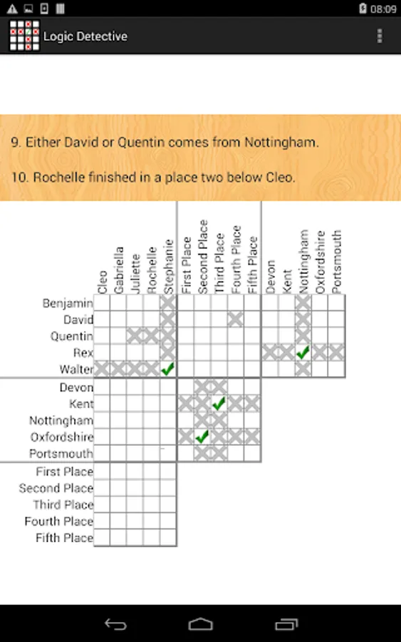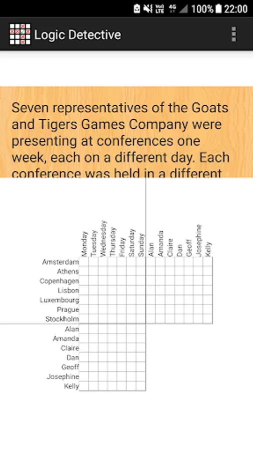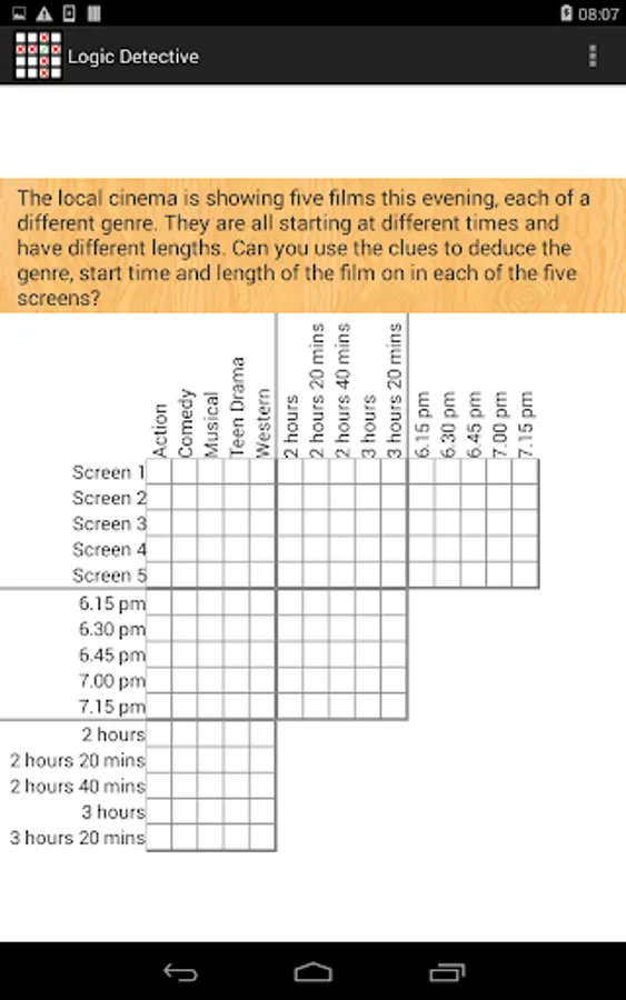Logic problems require you to use and develop your analytical skills. Use the clues to fill in the logic grid. Each scenario requires you to deduce connections between items such as groups of people, places, times and objects. Fill in all squares on the grid to complete the puzzle.