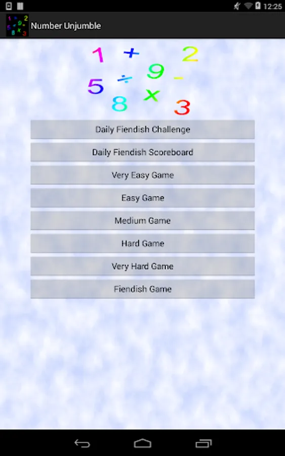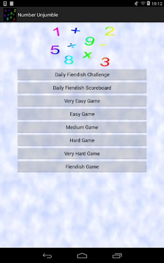 • Difficulty levels range from very easy (3 numbers) to fiendish (8 numbers)