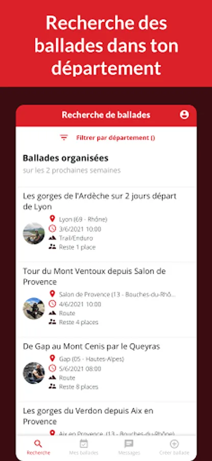 Access the list of road or trail/enduro motorcycle rides offered by bikers near you. Look at the details on the level of driving (beginner, experienced), on the style of ride (quiet, sporty), on the number of participants, and on the proposed route (starting point, breaks, routes taken...) .