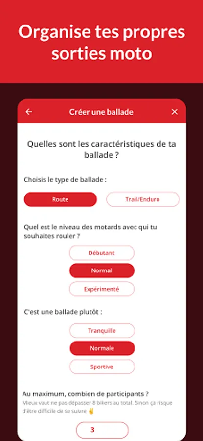 Fill in the date and place of departure, the time of return, your level of driving (beginner, experienced), your style of driving (quiet, sporty), the maximum number of bikers with whom you wish to ride, etc... Gives details on the meeting point, the proposed route, the planned breaks (meal, sandwich...).