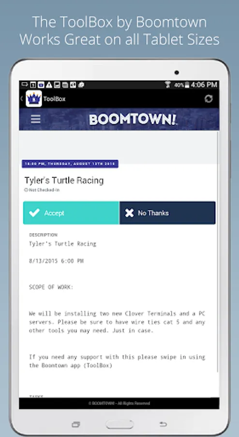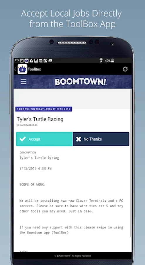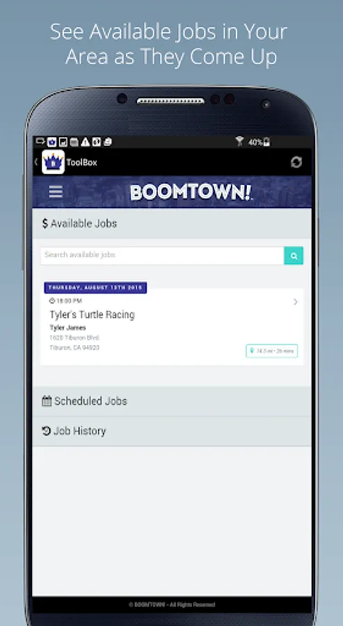 Access to the Toolbox app is only available for active members of the Boomtown Brigade. As a Brigade member, you will be able to see available jobs in your area as they pop up, accept the jobs you wish to complete, and easily manage all the jobs in your pipeline.