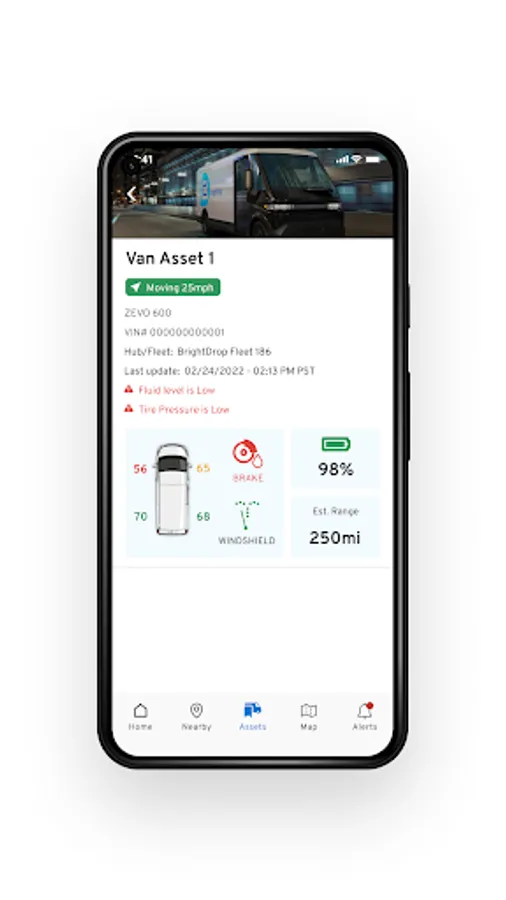 Get a closer look at your BrightDrop EVs. Key insights such as battery status, range estimation, and location data can help you understand the demand and needs of your EV fleet.