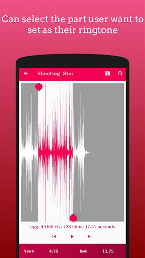 Make your own unique free ringtones is fast and easy. You can set the starting and ending notes by sliding arrows along the timeline, by pressing Start and End to record the point, or by typing in time stamps. This app is also a music editor/alarm tone maker/ ringtone cutter and notification tone creator.