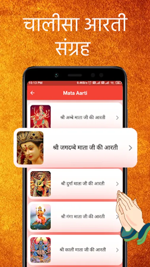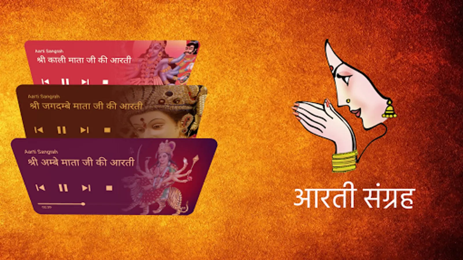 Ganesh ji, Om Jai Jagdish Hare, Shiv ji, Aarti Kunjbihari ki, Shri Bankebihari, Shri Ram, Hanuman Ji, Shri Ramayan, Shani dev, Shri Satyanarayan, Shri Amba ji, Shri Durga ji, Shri Vaishno ji, Shir Parvati mata, Shri Laxmi ji, Shri Saraswati ji, Shri Ahoi mata, Shri Ekadashi mata, Shri Santoshi ma, Shri Ganga ji, Shri Gayatri mata, Shri Lalita mata, Shri Tulsi ji