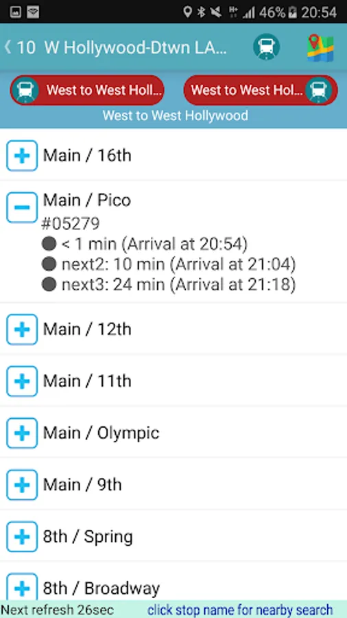 - Provide nearby stop locations in a map. Click on the map to select a specific stop. You can explore all bus routes via the stop