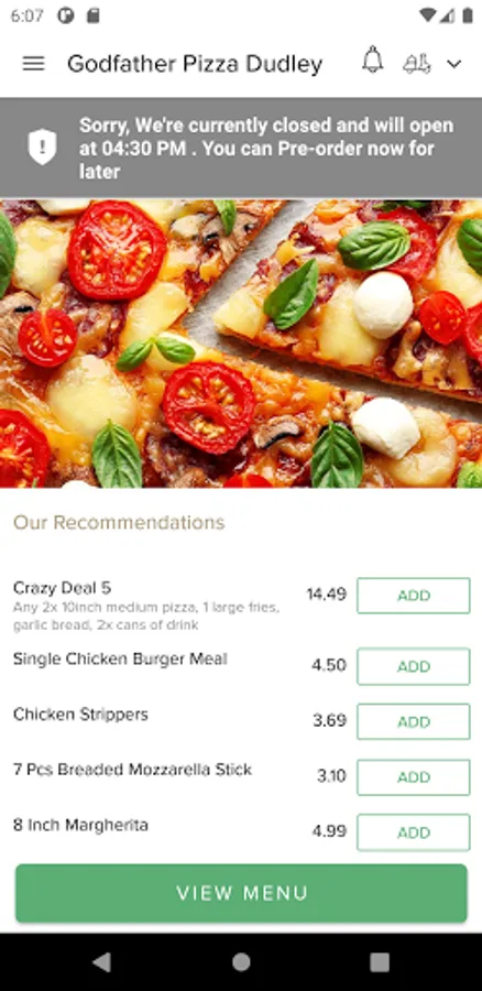 Here at Godfather Pizza Dudley we are constantly striving to improve our service and quality in order to give our customers the very best experience. As a result, we are finally proud to unveil and introduce our latest improvement, our new online ordering app! You can now relax at home and order your favourite, freshly prepared meals from Godfather Pizza Dudley in Dudley . You can even pay online!