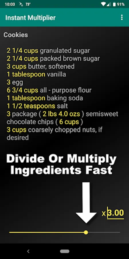 This app was created because I found myself multiplying and dividing recipes constantly. I decided to make this app that scales up or scales down a recipe in an instant. Most recipe apps I've found were slow or limited. I sincerely hope this app helps you with your home cooking, cooking for the holidays and/or assist you with recipes for work!