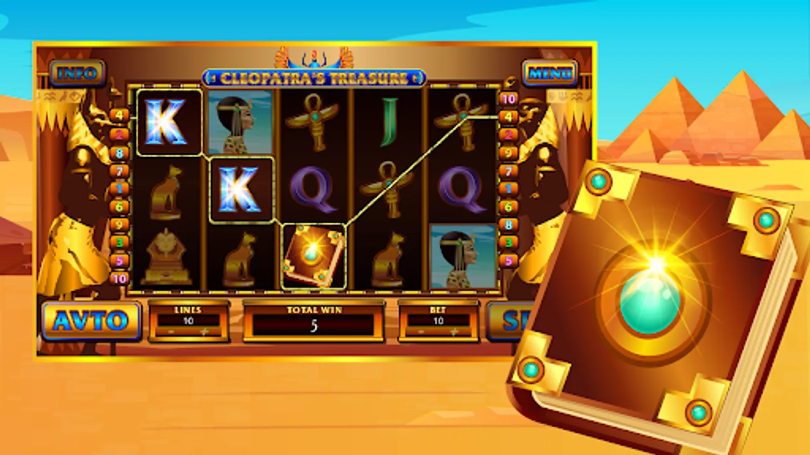 The game is based on the story of the beautiful Egyptian queen Cleopatra, and therefore in the course of the game there will be many references to Egyptian culture. However, whether you like Ancient Egypt or not, it doesn't matter: anyone should play Cleopatra's Treasure Slot!
