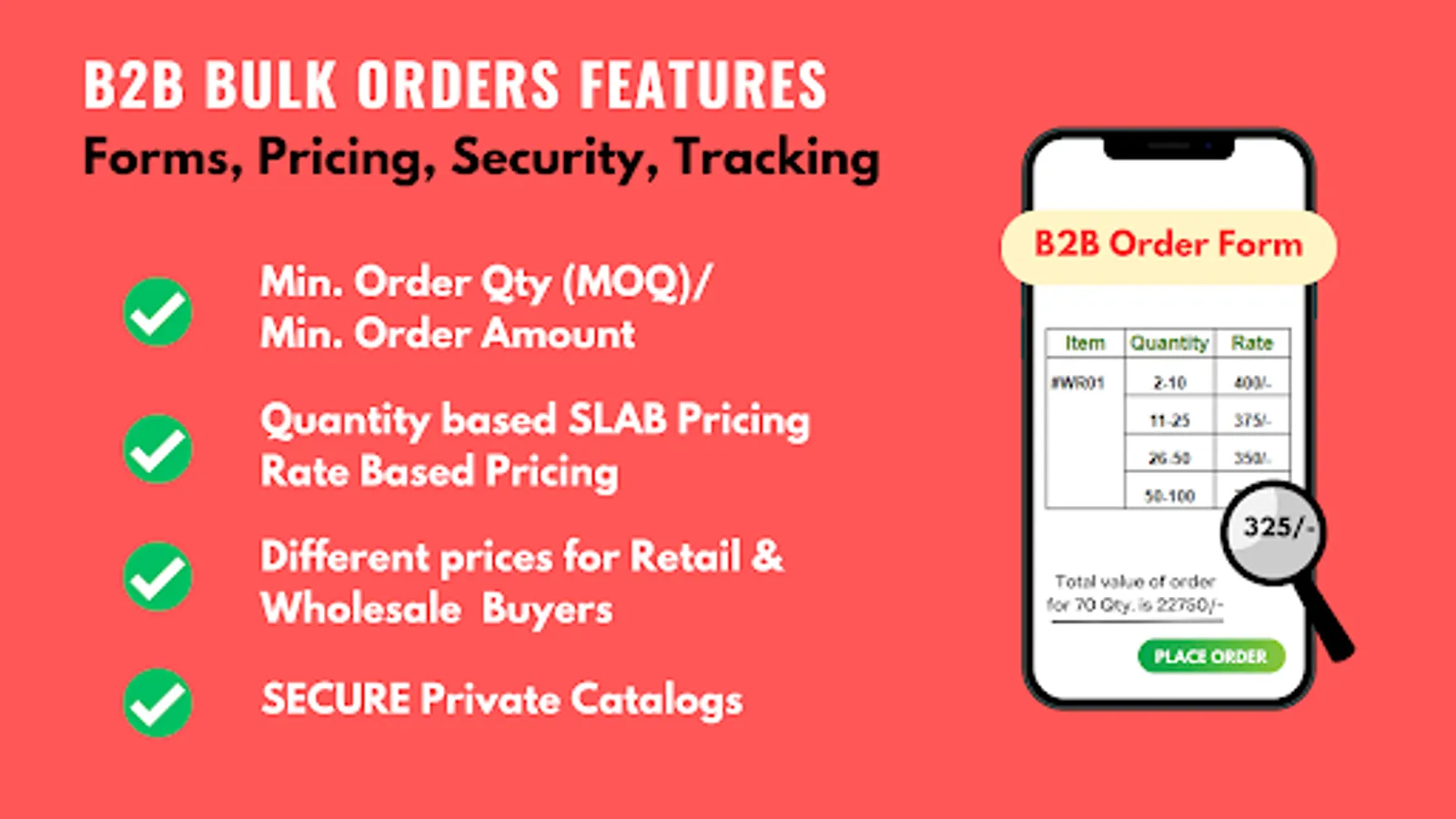 India's π₯First app focused on Bulk / Wholesale Selling with features - Minimum Order Quantity (MOQ), Minimum Order Amount, Quantity based Slab pricing, Retail and Wholesale dual pricing, Custom Variations, Catalog Privacy settings, Inventory and Invoice Management, Buyer Management, OTP Security, Data Privacy etc.